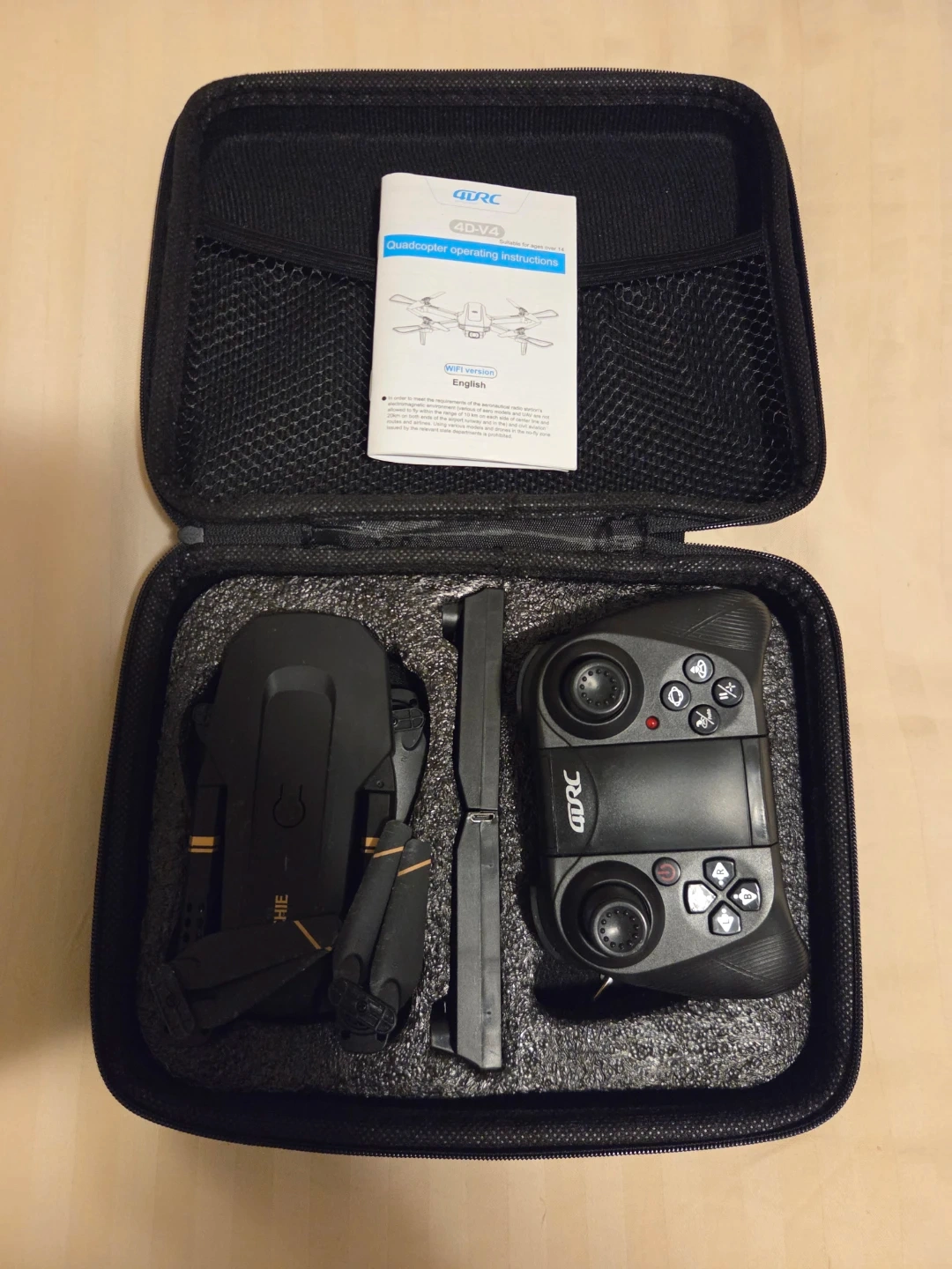 This is a GDRC 4D-V4 quadcopter drone. It's the WiFi version and suitable for ages over 14. Includes the drone, controller, charging cable, and carrying case.