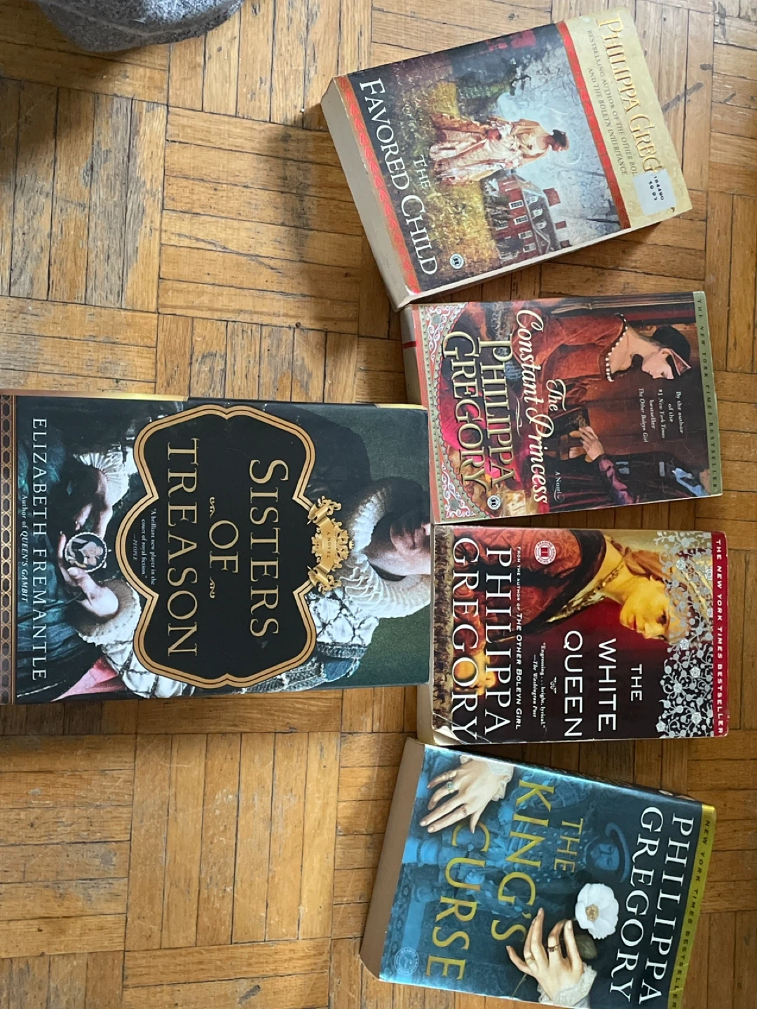 Bundle of five paperback historical fiction novels. Includes "Sisters of Treason" by Elizabeth Fremantle and four books by Philippa Gregory: "The King's Curse", "The White Queen", "The Constant Princess", and "The Favored Child". Great for historical fiction fans!