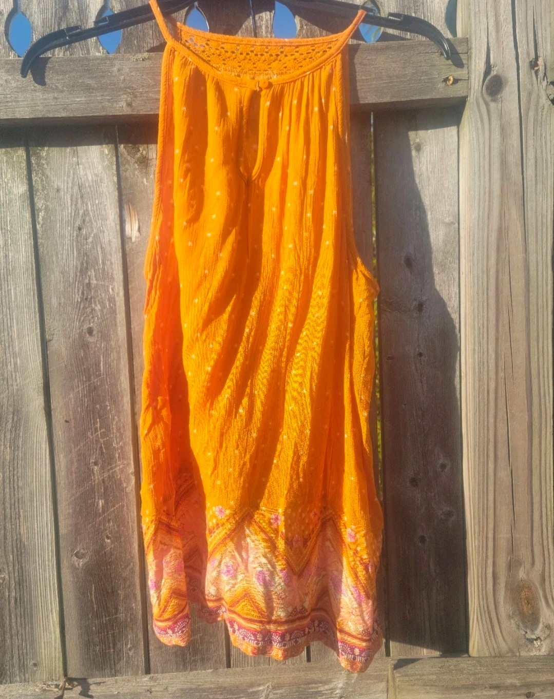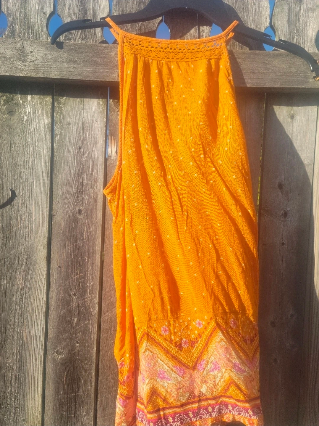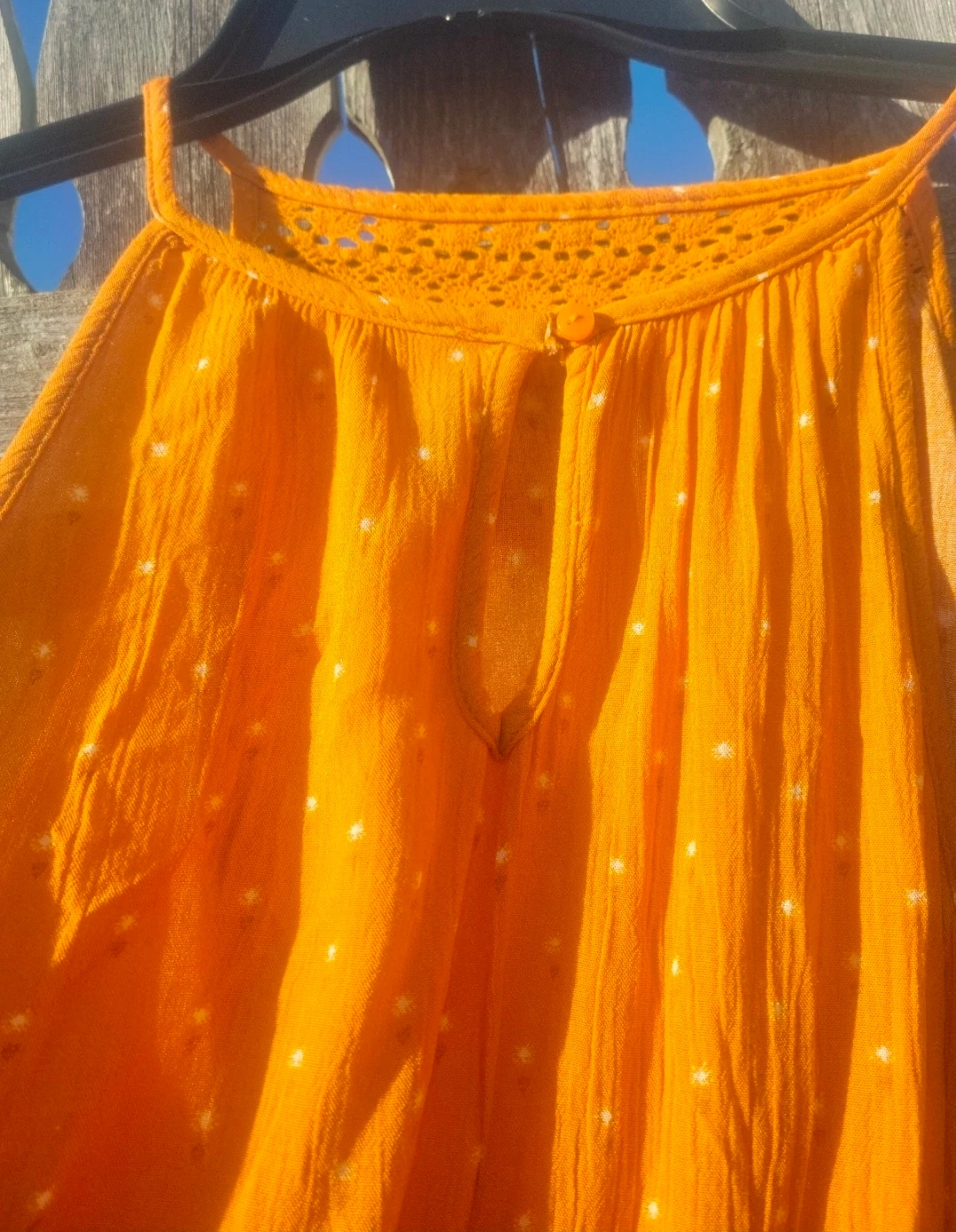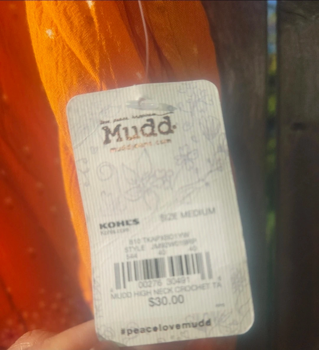 Here's a cute Mudd high neck crochet tank top! It's a size medium and features a stylish crochet design around the neckline. The color is a vibrant orange. Originally bought for $30
