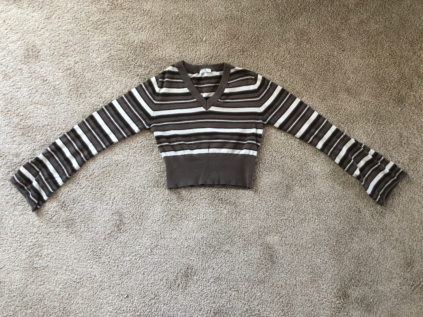 This V-neck sweater features a brown, white, and grey stripe pattern. It has long sleeves with a fitted cuff and a ribbed hem. The material feels soft and stretchy.