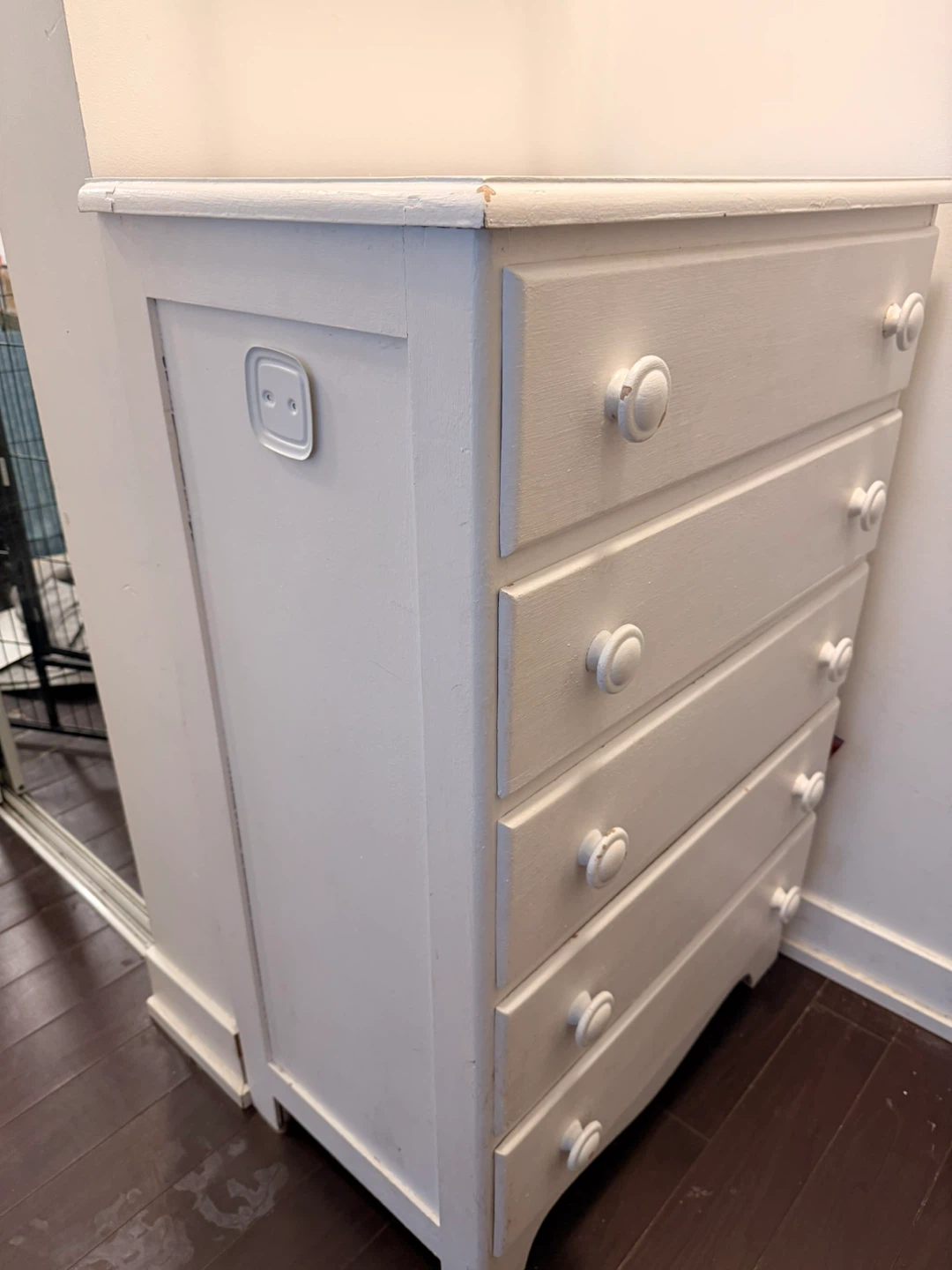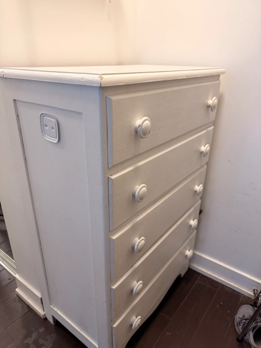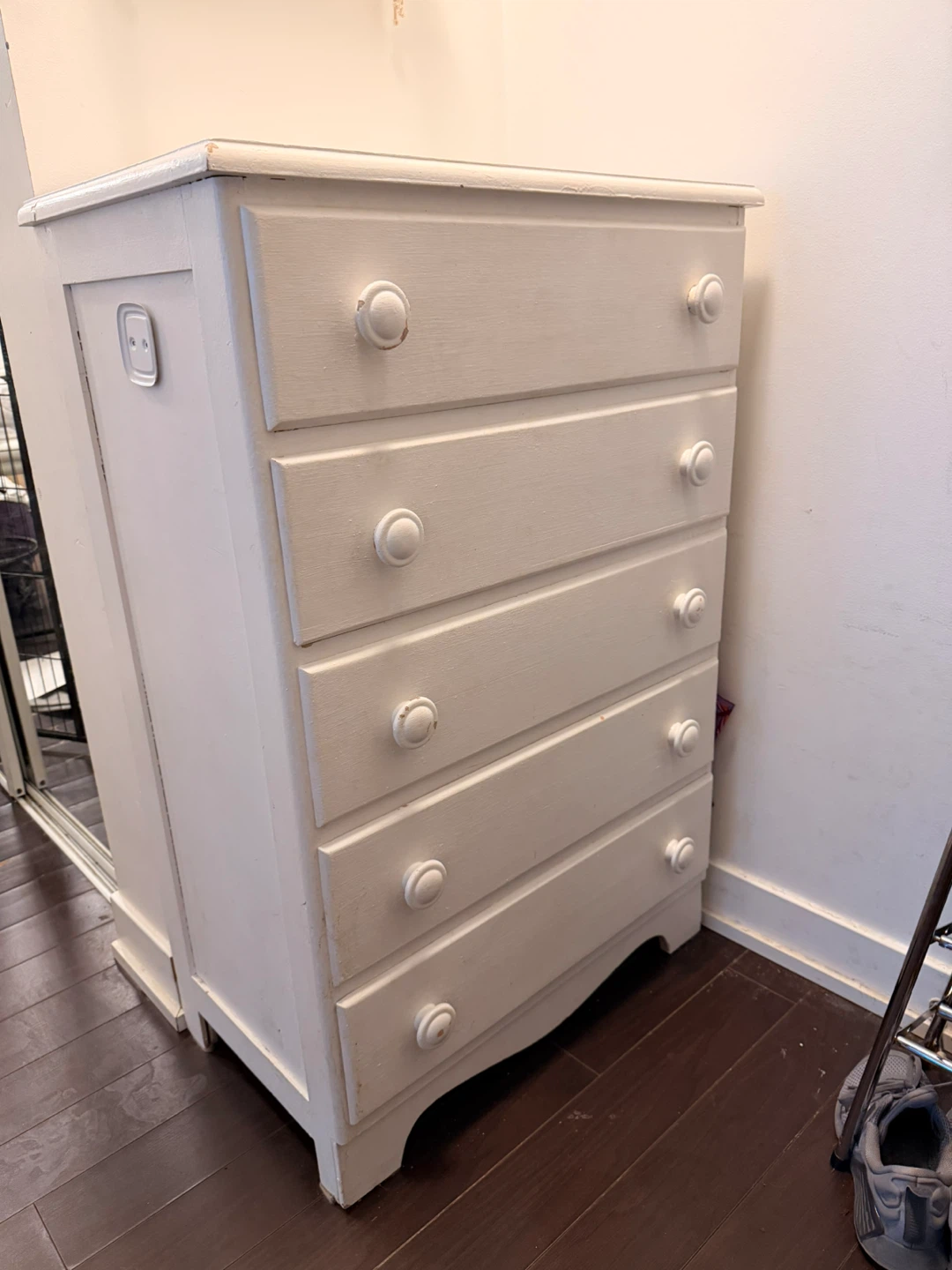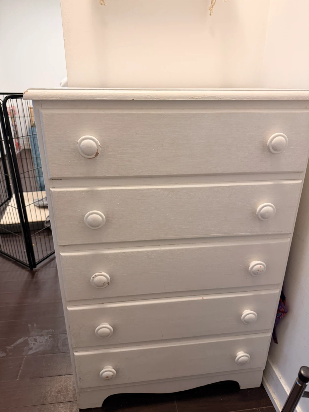 This is a classic white dresser with five drawers. It's made of wood and features simple round knobs. This dresser offers good storage for clothes or linens.