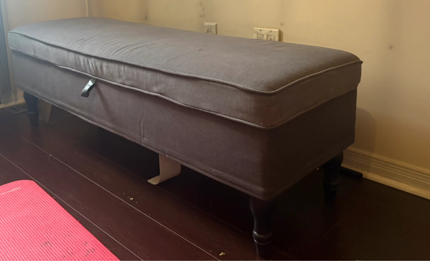 This upholstered bench offers a convenient storage solution. Its dark grey fabric complements many decor styles. The cushioned top provides comfortable seating.