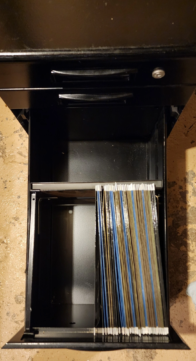 Selling a black metal filing cabinet with three drawers. All drawers have adjustable spacers. It has some signs of use, but it's still in good working condition.