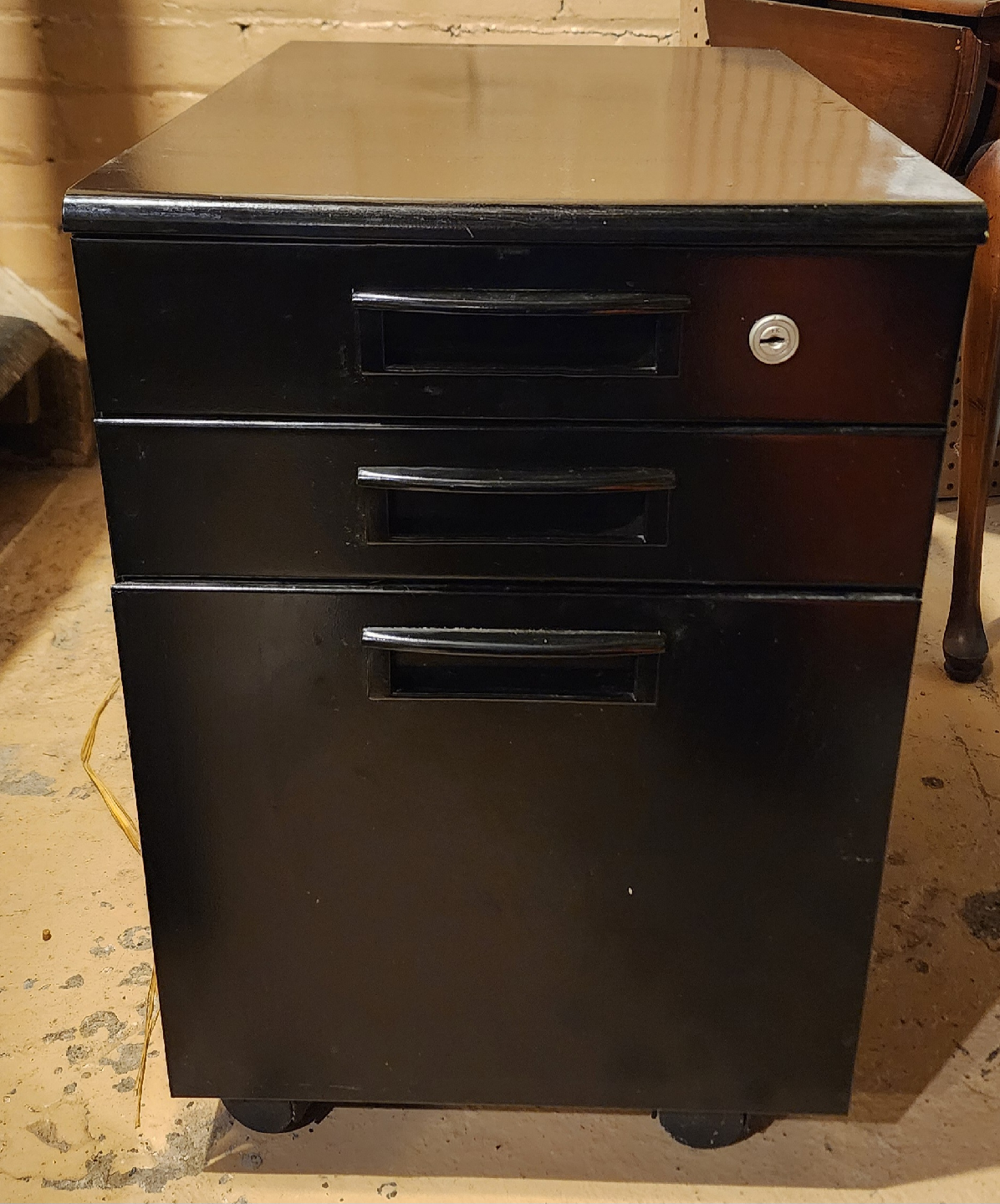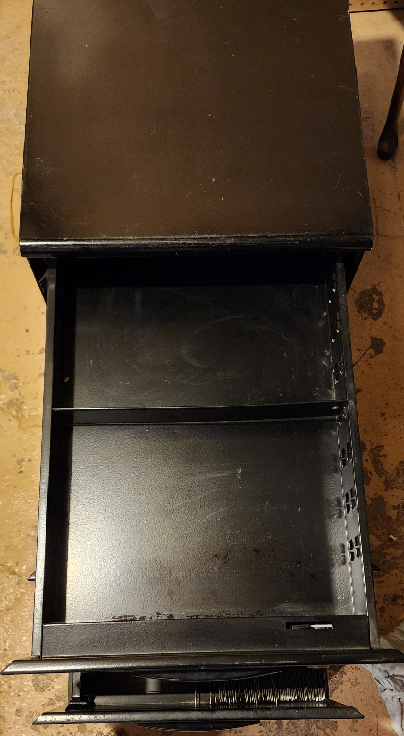 Selling a black metal filing cabinet with three drawers. All drawers have adjustable spacers. It has some signs of use, but it's still in good working condition.