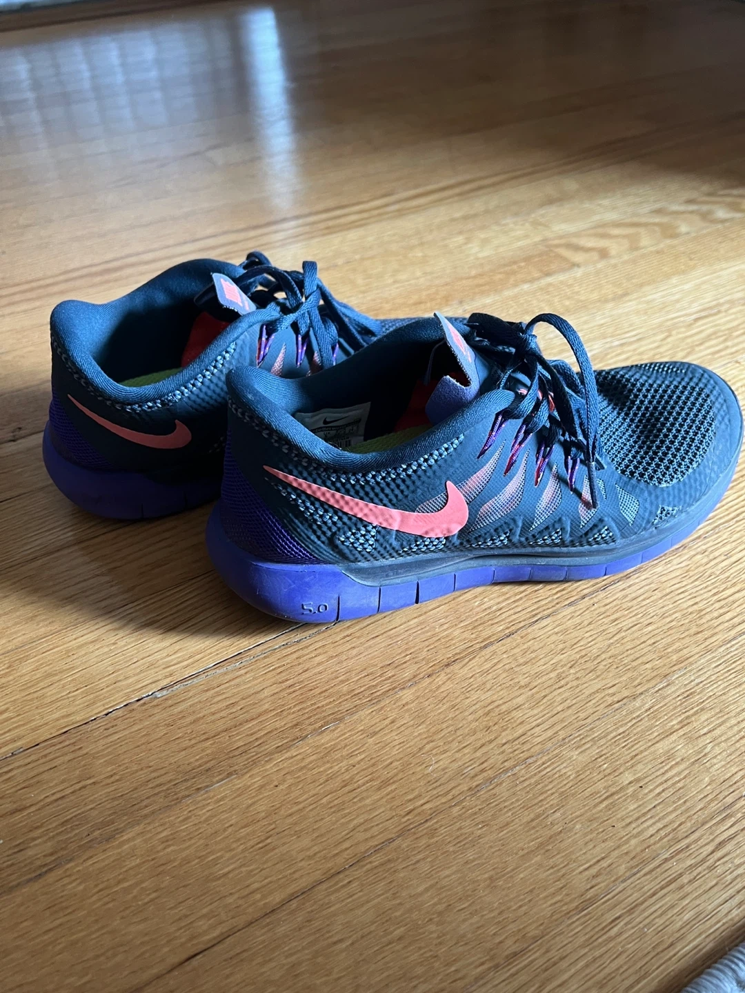 Dark blue and purple Nike Free 5.0 running shoes for women. Size is US 7.5, UK 5, EUR 38.5. These shoes have a mesh upper and a flexible sole.