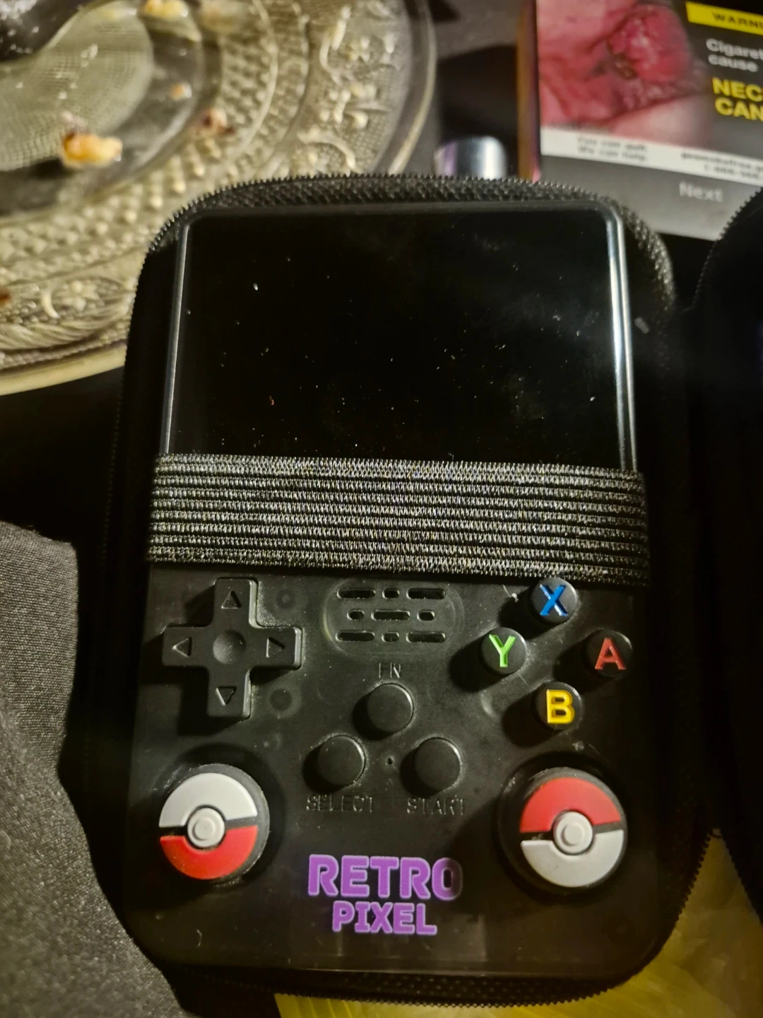 This is a RETRO PIXEL handheld gaming console. It features a D-pad, action buttons, and analog joysticks. Comes with a protective case. It has 2 memory chips on either side of the console both full of different types of games. Takes a basic c-charging cable. Works great . Comes in case and instructions