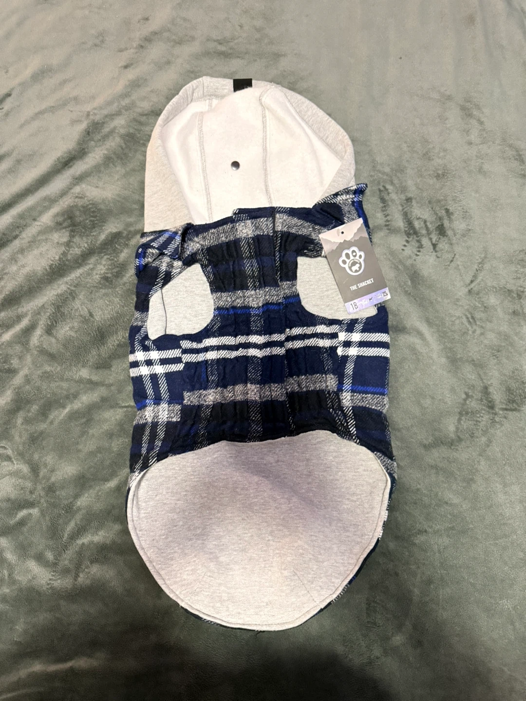 This Canada Pooch dog jacket features a blue and white plaid pattern with a grey hood. It's a size 18, perfect for keeping your furry friend warm. The jacket has two decorative chest pockets.
