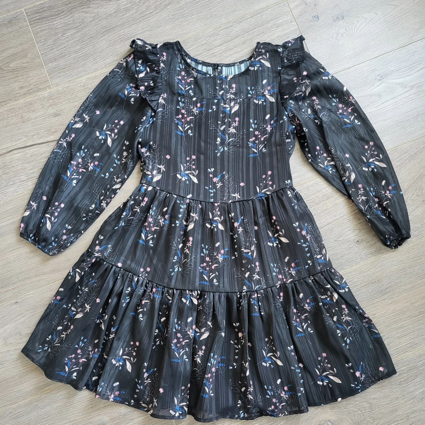 This is a lovely Zac Posen dress in a size 12. It features a beautiful floral pattern on a black background. Perfect for any occasion! Worn once for family pictures.