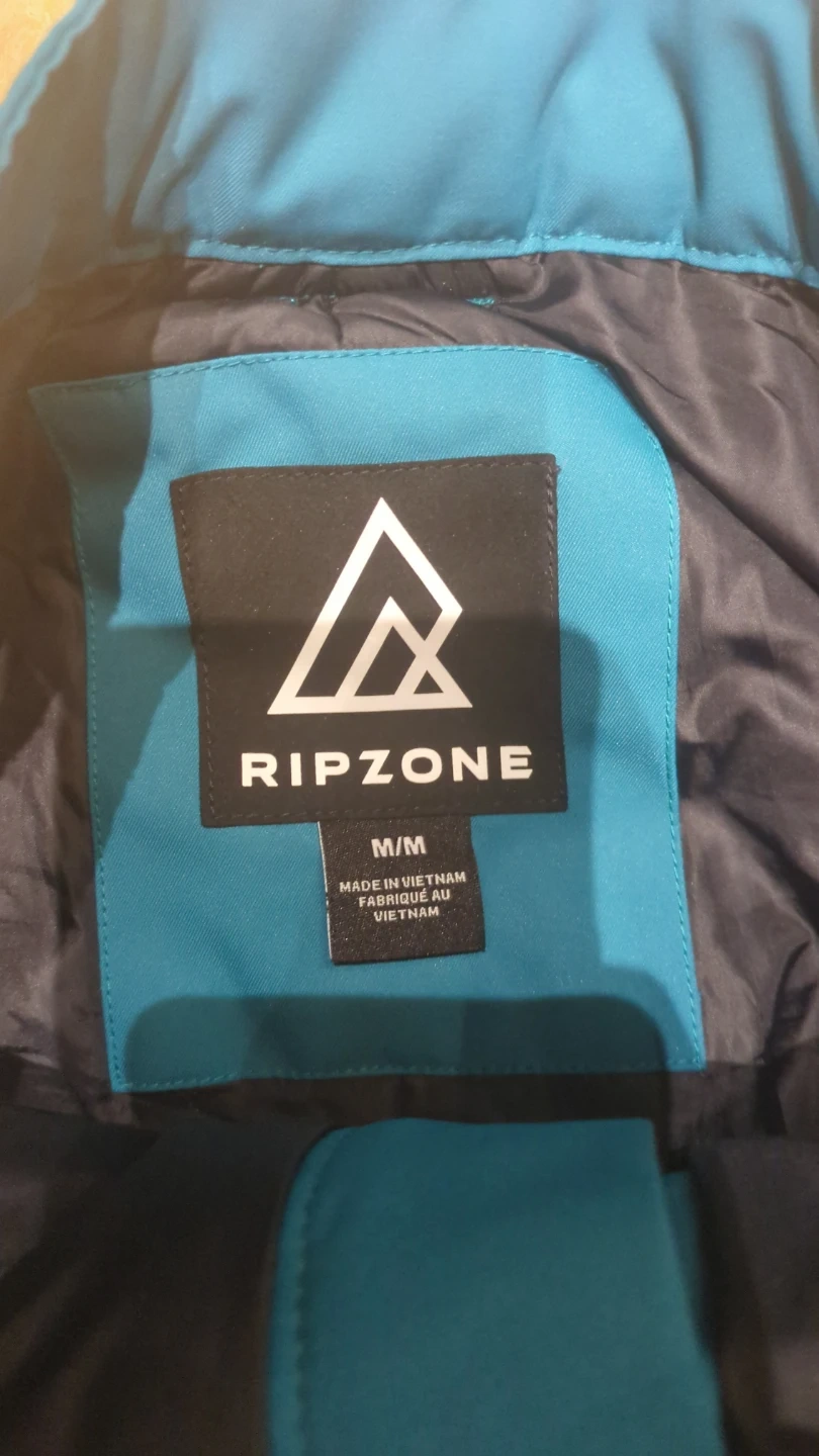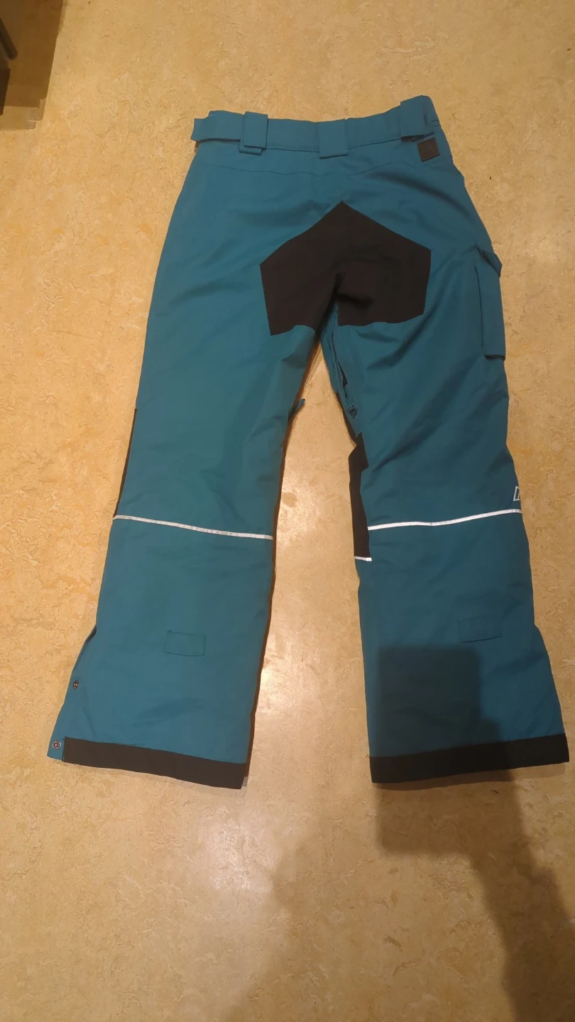 These Ripzone ski pants are teal with black accents. Size medium/medium. They feature multiple pockets and reflective detailing on the legs.