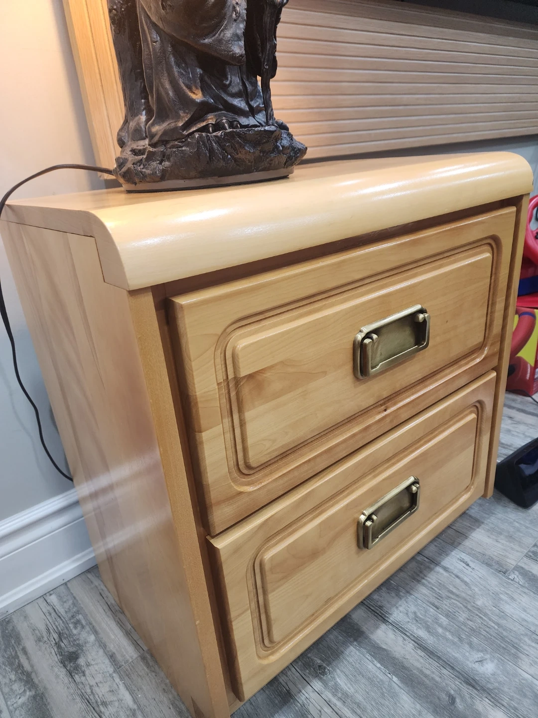 A classic light wood nightstand featuring two drawers with brass-coloured handles. It's perfect for storing bedside essentials. This nightstand would be a nice addition to a bedroom.
