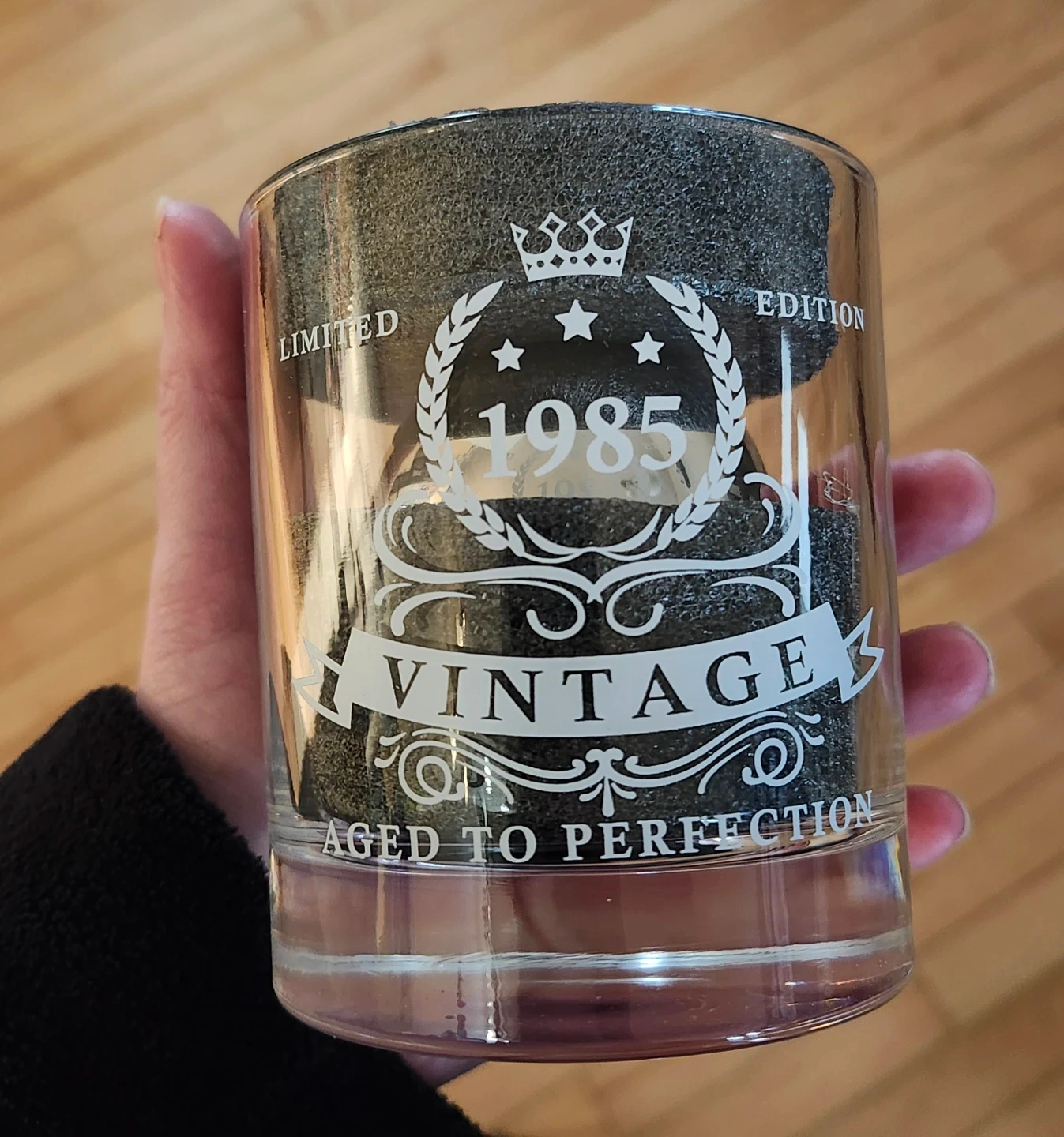 This set includes a "Vintage 1985" etched whiskey glass, a reusable stainless steel chilling sphere with cooling gel inside, and a small barrel-shaped storage box with tongs. The sphere is 2.2 inches in diameter and made of 304 stainless steel for quick chilling. This set makes a thoughtful gift for someone celebrating a 1985 birthday!