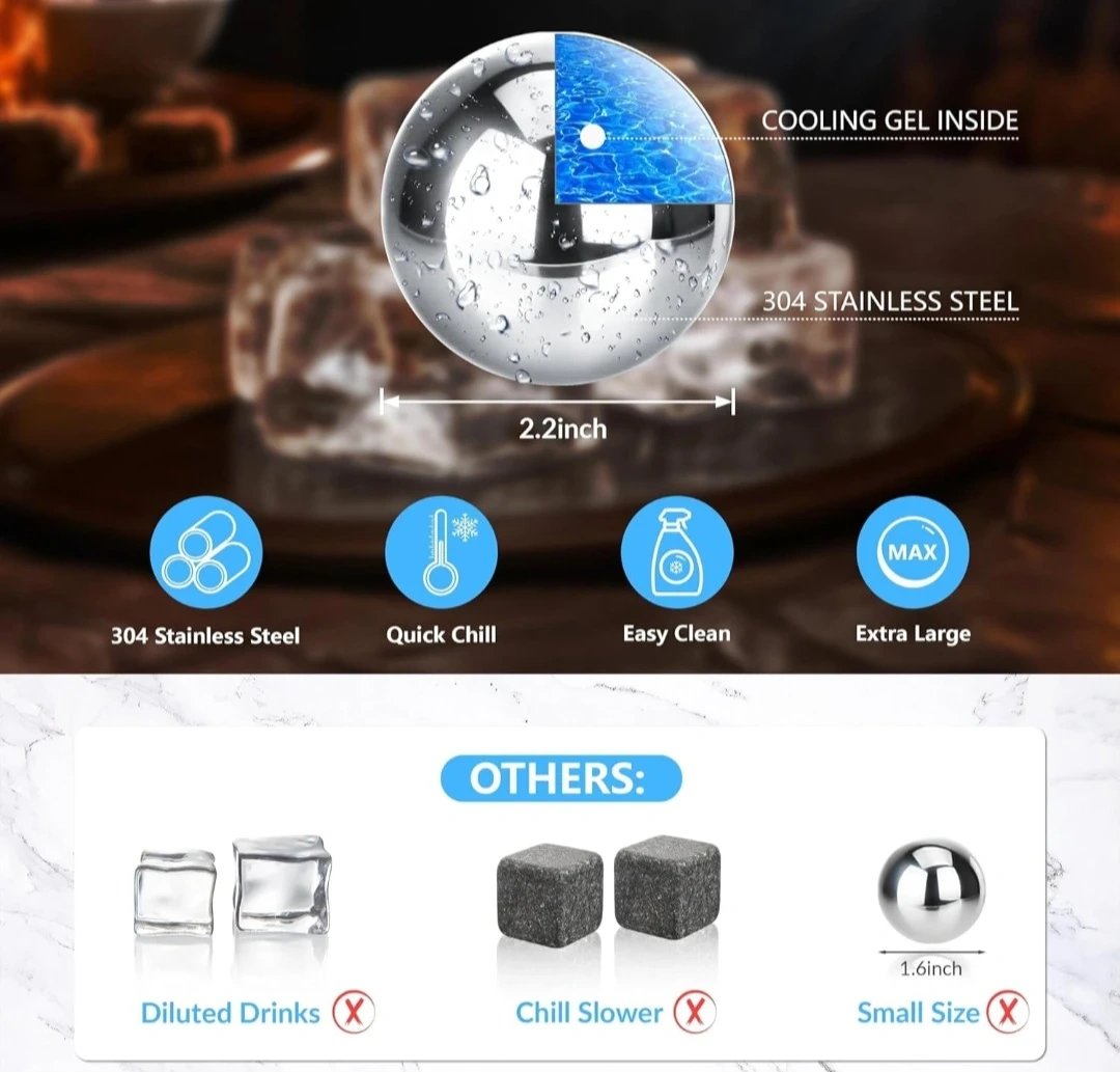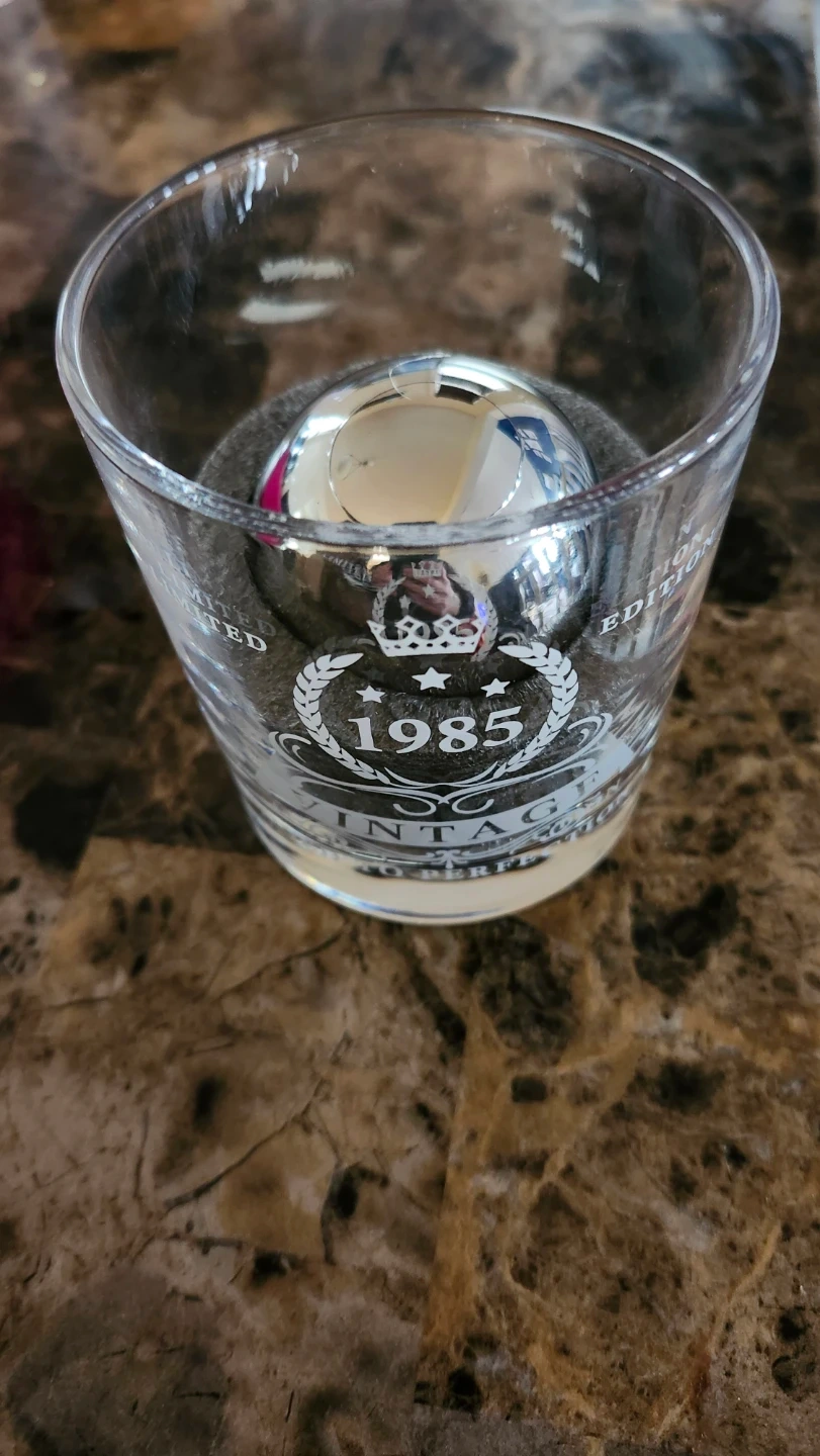 This set includes a "Vintage 1985" etched whiskey glass, a reusable stainless steel chilling sphere with cooling gel inside, and a small barrel-shaped storage box with tongs. The sphere is 2.2 inches in diameter and made of 304 stainless steel for quick chilling. This set makes a thoughtful gift for someone celebrating a 1985 birthday!