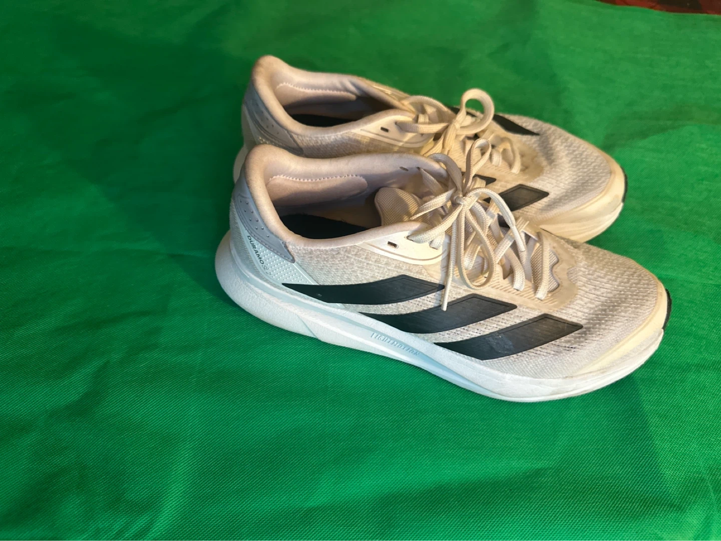 Adidas Duramo SL running shoes in white with black accents. Lightweight mesh upper for breathability. Rubber outsole for durability. Size 9 Men's.