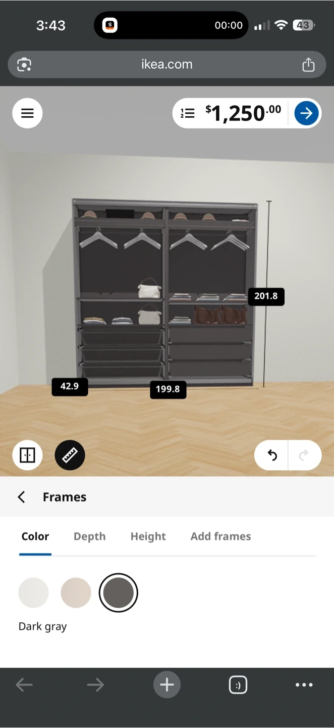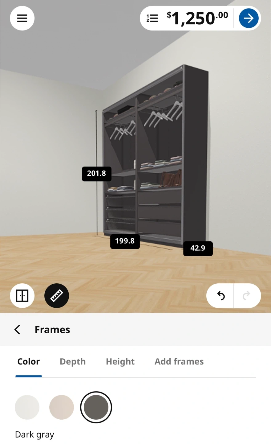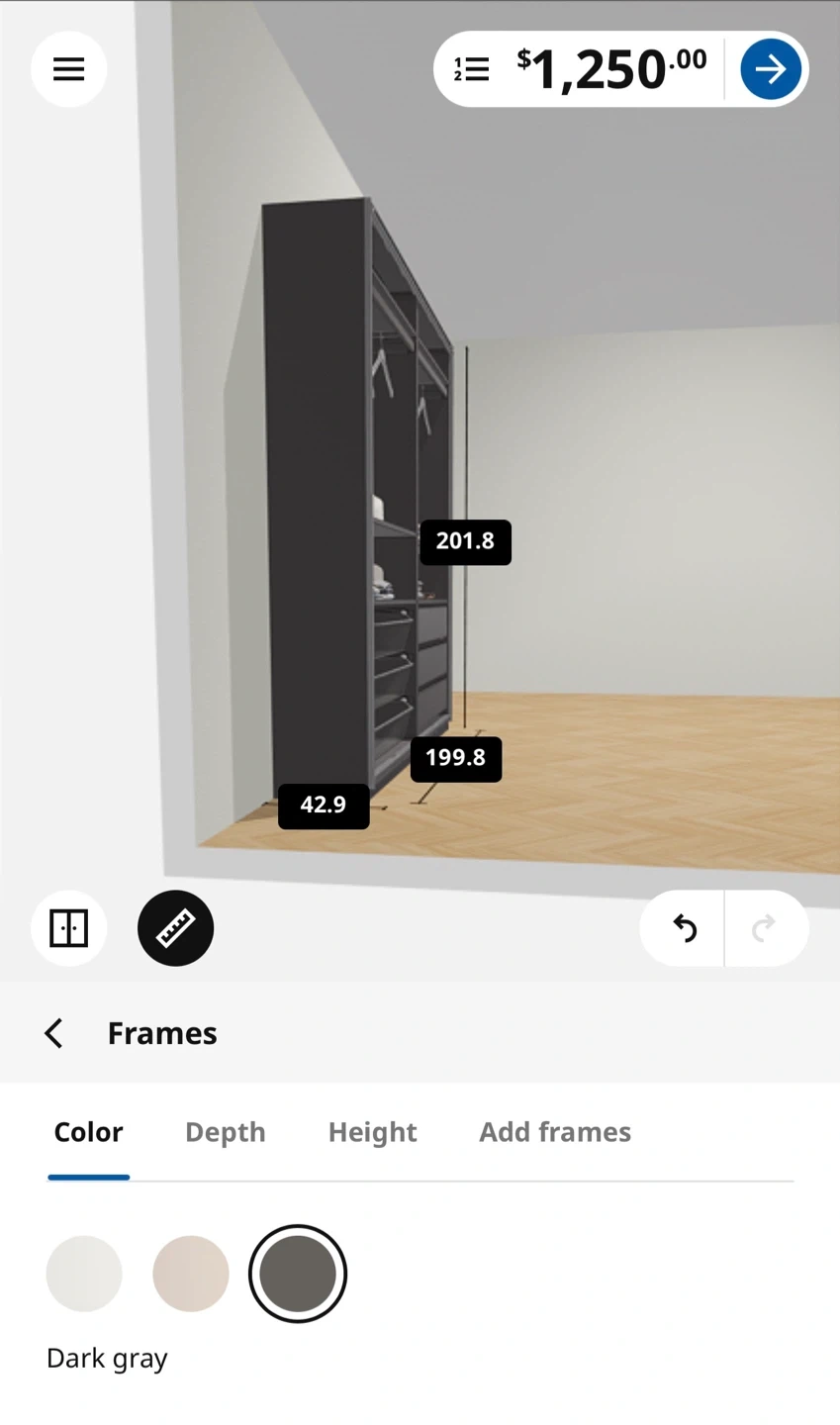 Dark gray wardrobe frame. It's 201.8 cm high, 199.8 cm wide, and 42.9 cm deep. Perfect for organizing your clothes!