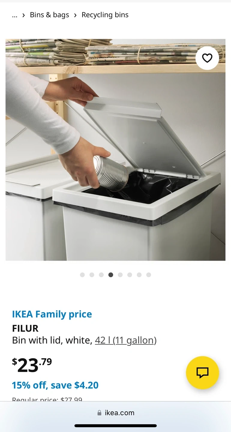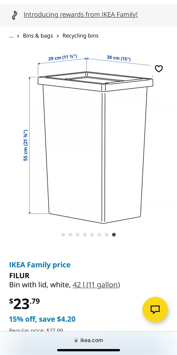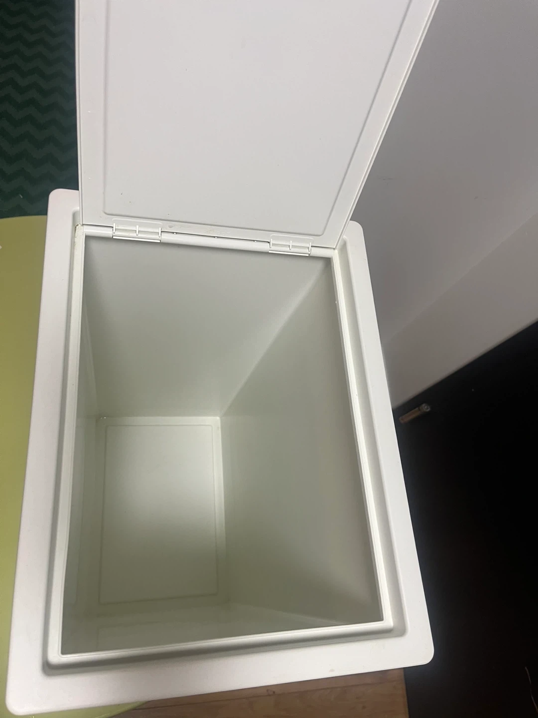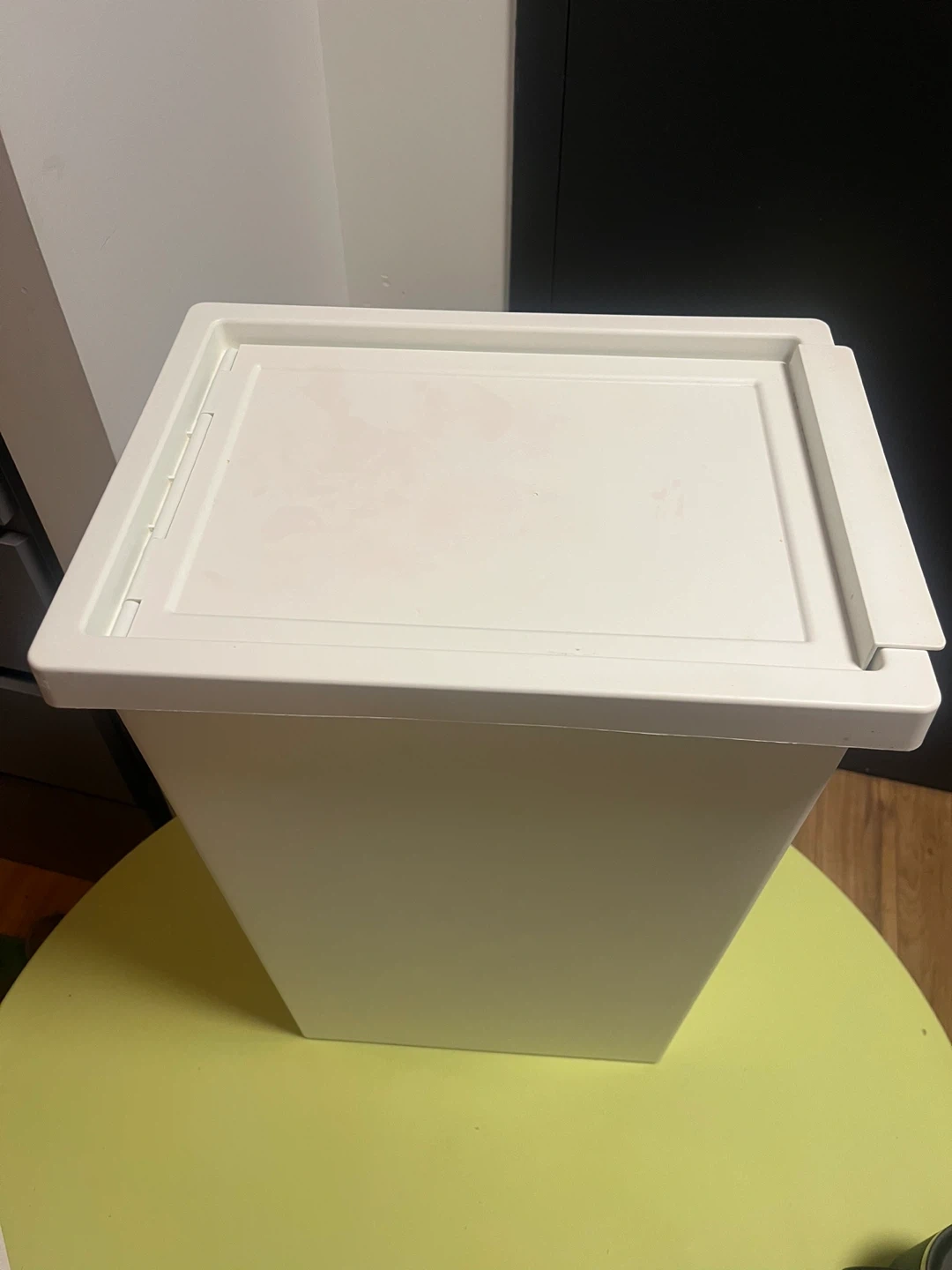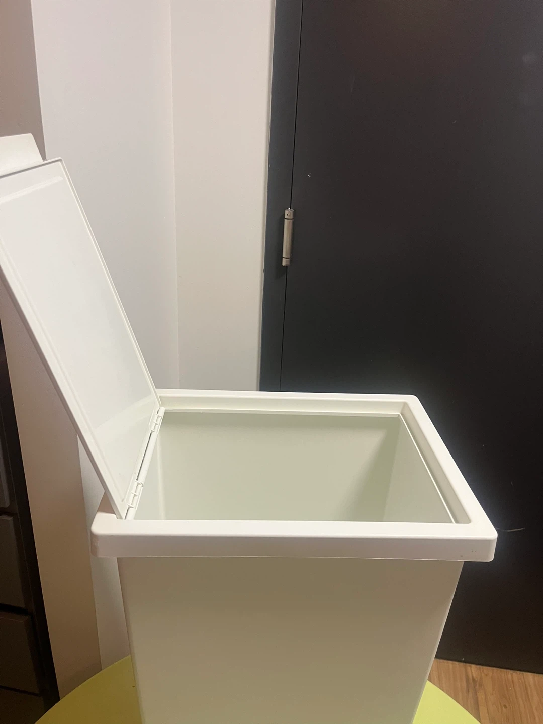 Selling a white IKEA FILUR bin with a lid. It holds 42L (11 gallons). Dimensions are 29 cm x 38 cm x 55 cm. Great for recycling