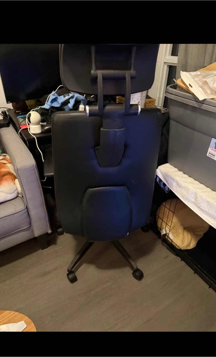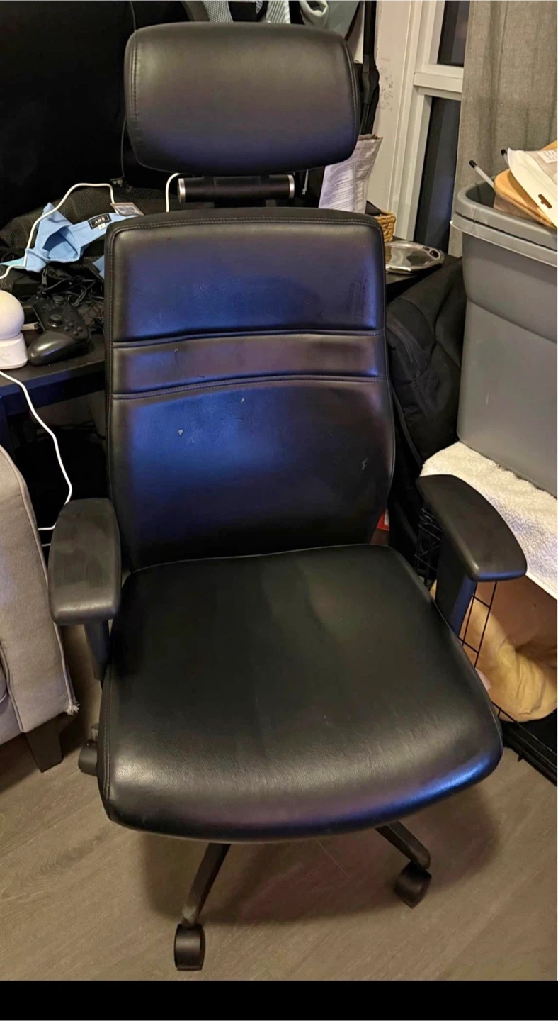 This black ergonomic office chair offers adjustable headrest and armrests for comfort. It's designed for extended sitting periods. Its sturdy base with wheels ensures easy mobility around your workspace.