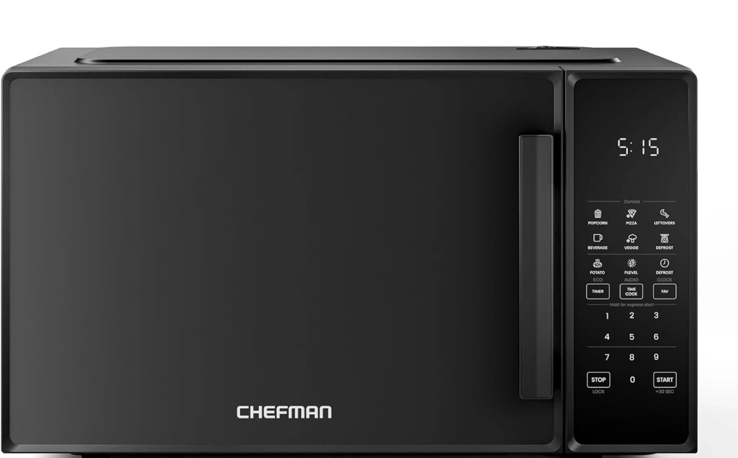 This is a black CHEFMAN microwave. It features a digital display and various preset cooking options. Includes turntable and power cord. Chefman Countertop Microwave Oven 1.1 Cu. Ft., 1000 Watts with 10 Power Levels, 6 Cooking Presets with One-Touch Express Cook, Eco Mode, Child Safety Lock, & Mute Button - Black