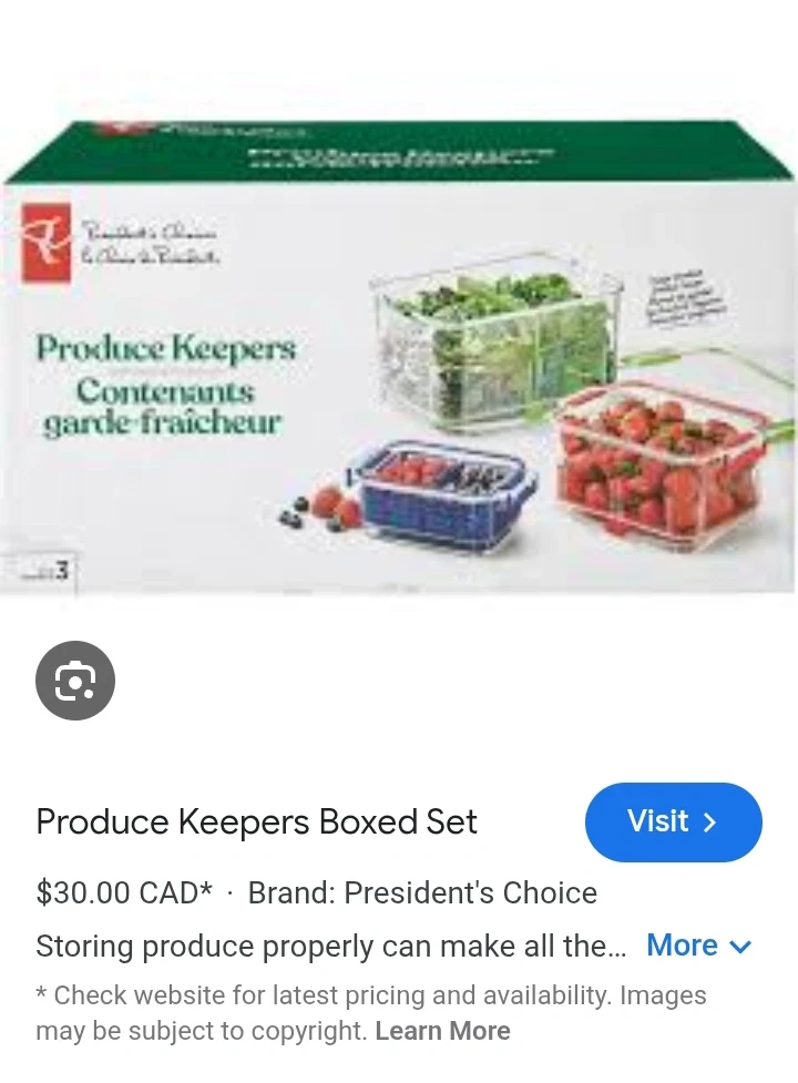 This is a set of President's Choice Produce Keepers. It includes multiple containers designed for storing fruits and vegetables. These keepers help to keep produce fresh longer.