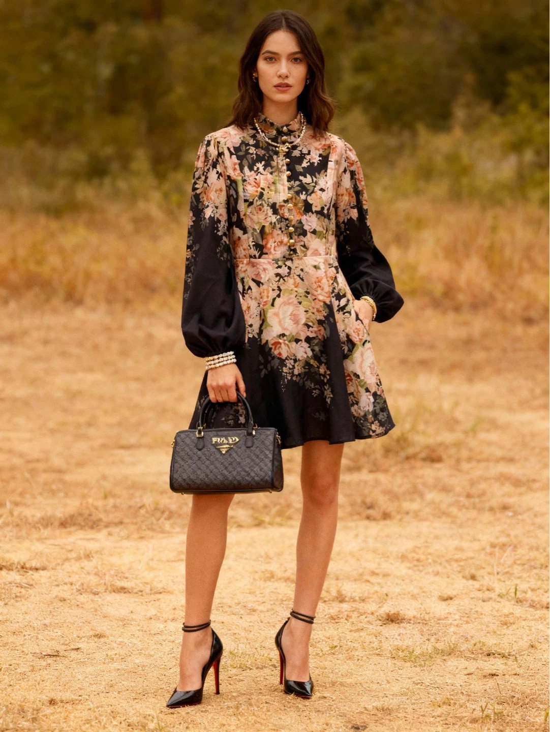 This is a lovely floral print mini dress with long sleeves. It features a high neckline with button details and a belted waist. The dress has a black and pink floral pattern.