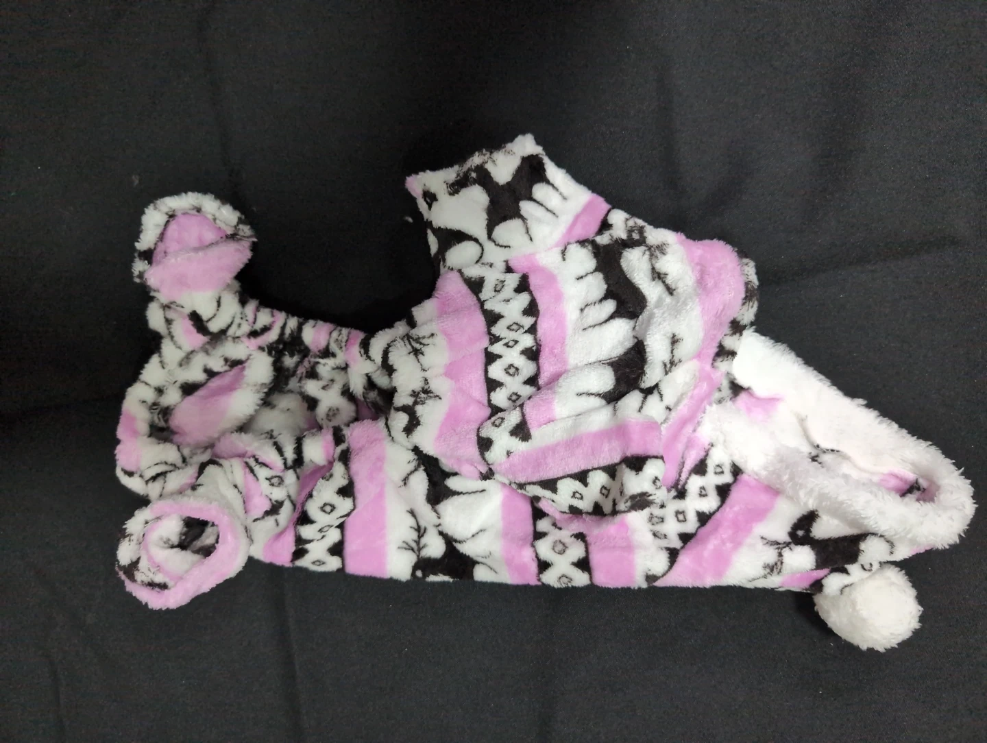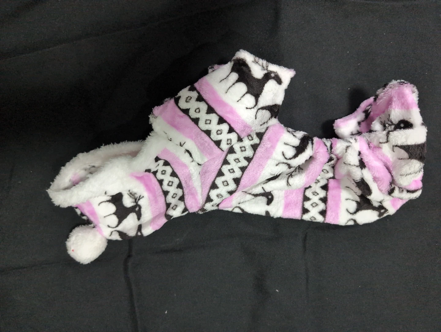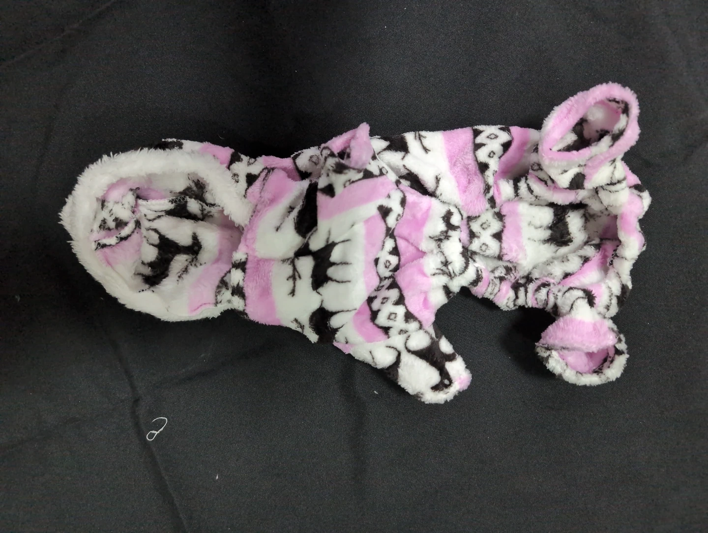 Here's a cozy dog onesie in a fun pattern of pink, white, and black! It's perfect for keeping your furry friend warm on chilly days or nights. It is ready for a new pup to enjoy. Size Selection XL(front legs to butt 14") and L(front legs to butt 11" ),5 color patterns.