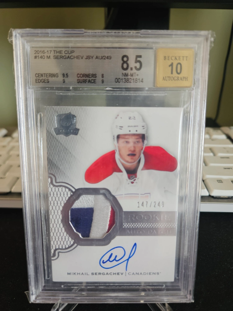 Selling a 2016-17 The Cup #140 Mikhail Sergachev JSY AU/249 rookie auto patch card. It has a Beckett autograph grade of 10 and an overall grade of 8.5. The centering is 9.5, corners are 8, edges are 9, and surface is 9. Card number is 0013821814.
