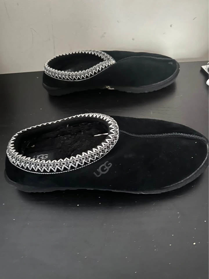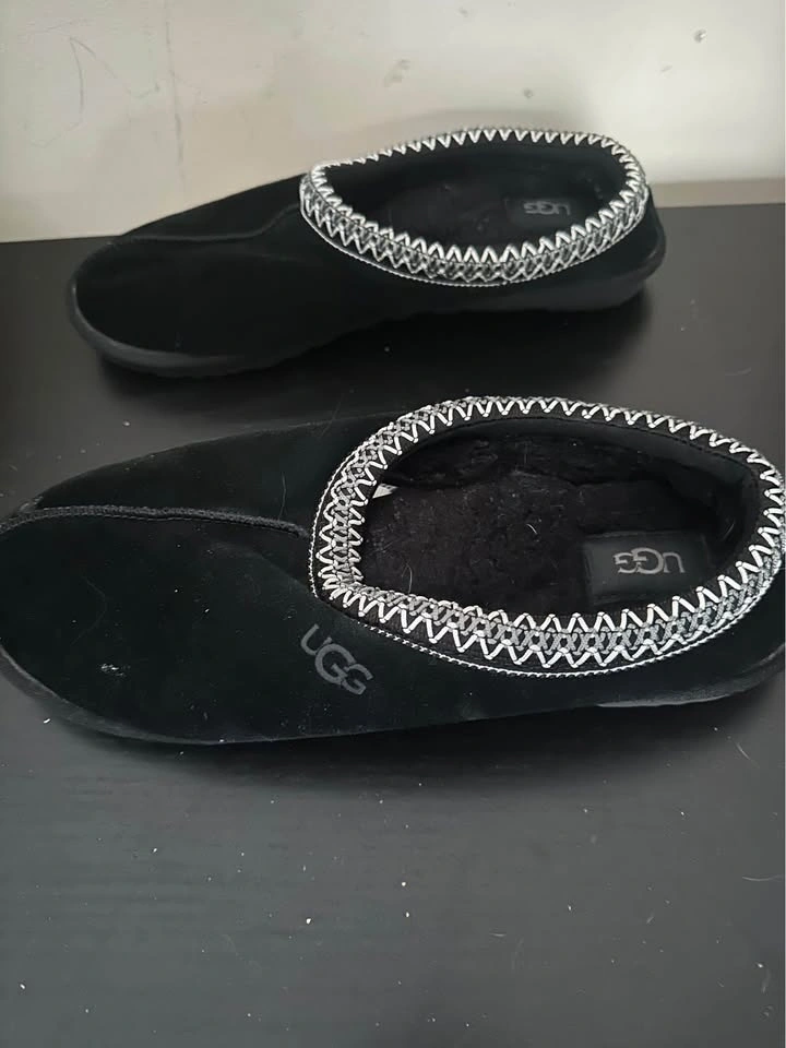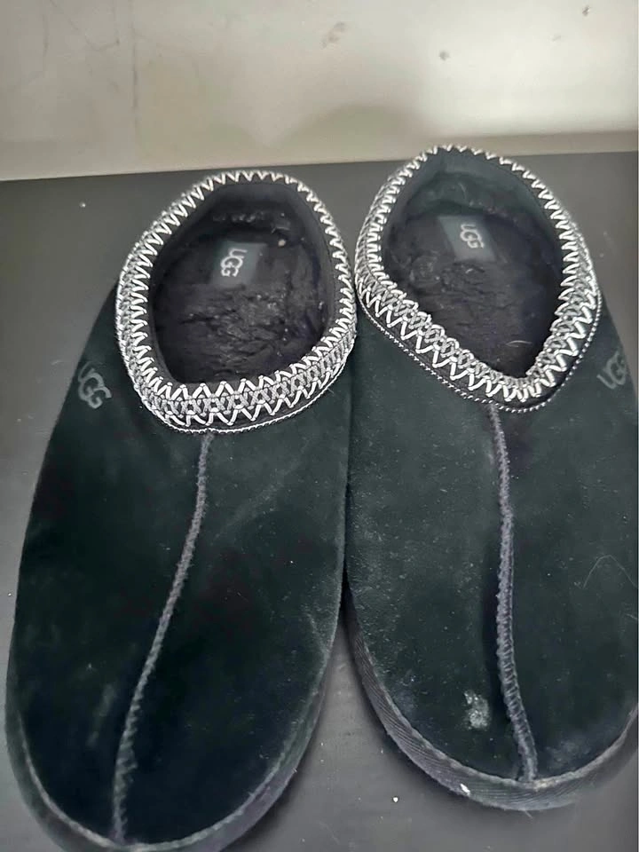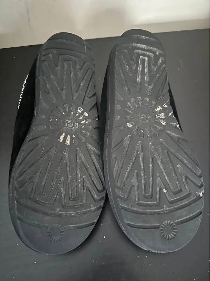 These shoes feature a suede upper, UGGbraid made with 100% recycled polyester fibers, 17mm sheepskin lining, 17mm sheepskin insole, foam footbed, sugarcane EVA outsole, recycled polyester binding, and a heat-embossed UGG Logo. Black colourway. In good used condition. Cleaned and sanitized.