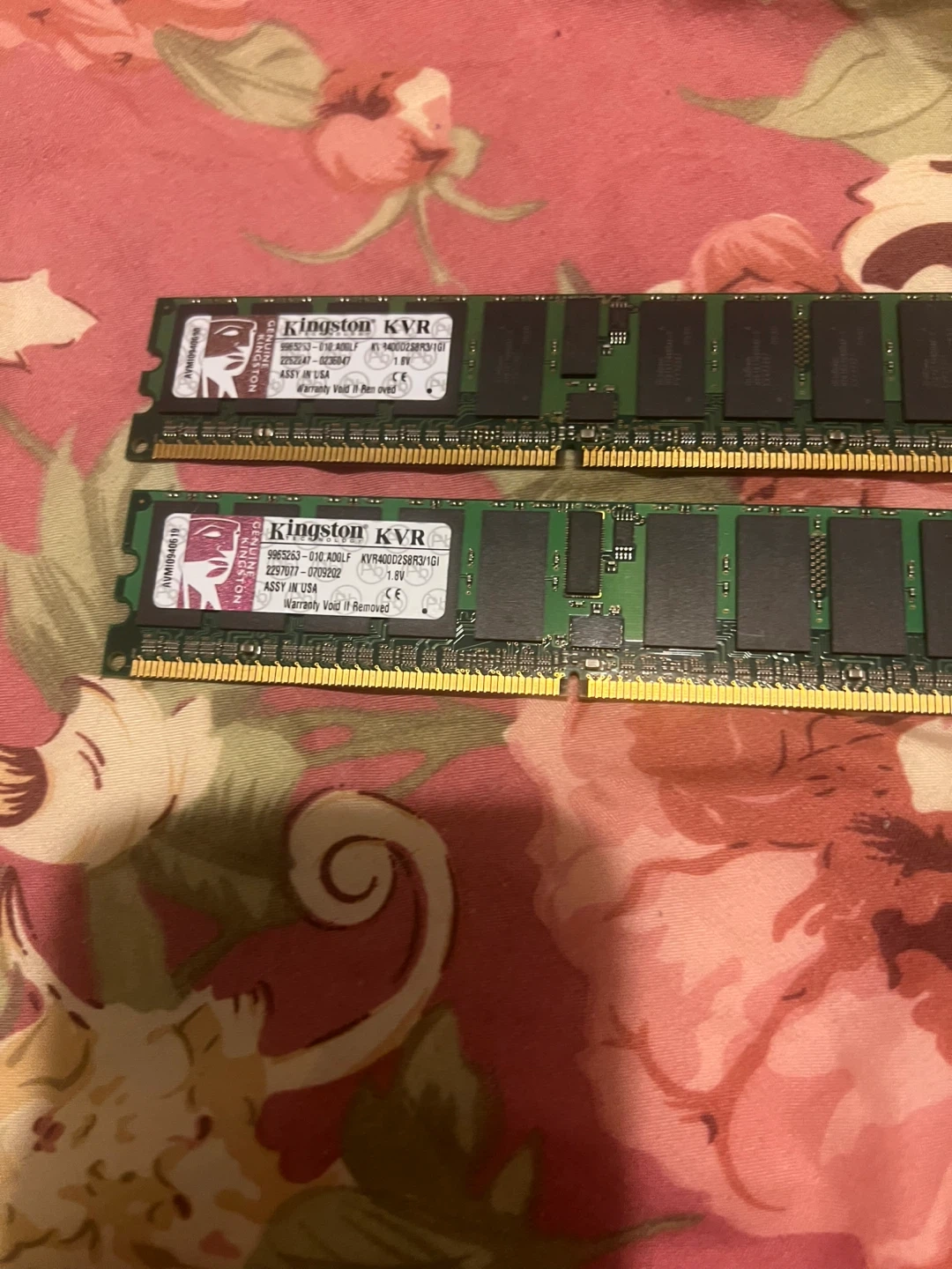 Two Kingston KVR memory modules are included. Each module has a capacity of 1GB and operates at 1.8V. These are DDR2 modules.
