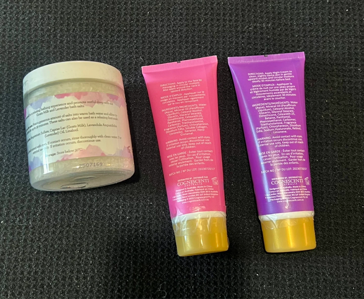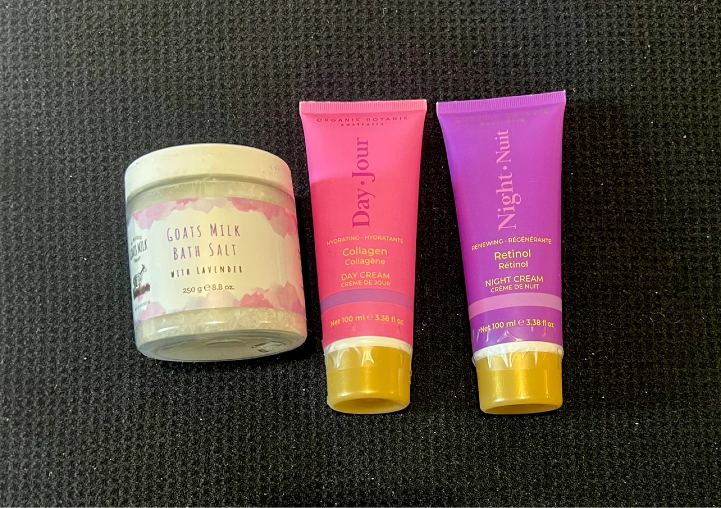 Collagen Day Cream and Retinol Night Cream Includes a jar of Goats Milk Bath Salt with lavender. Both creams are 100 ml / 3.38 fl oz. Bath salt is 250 g / 8.8 oz.