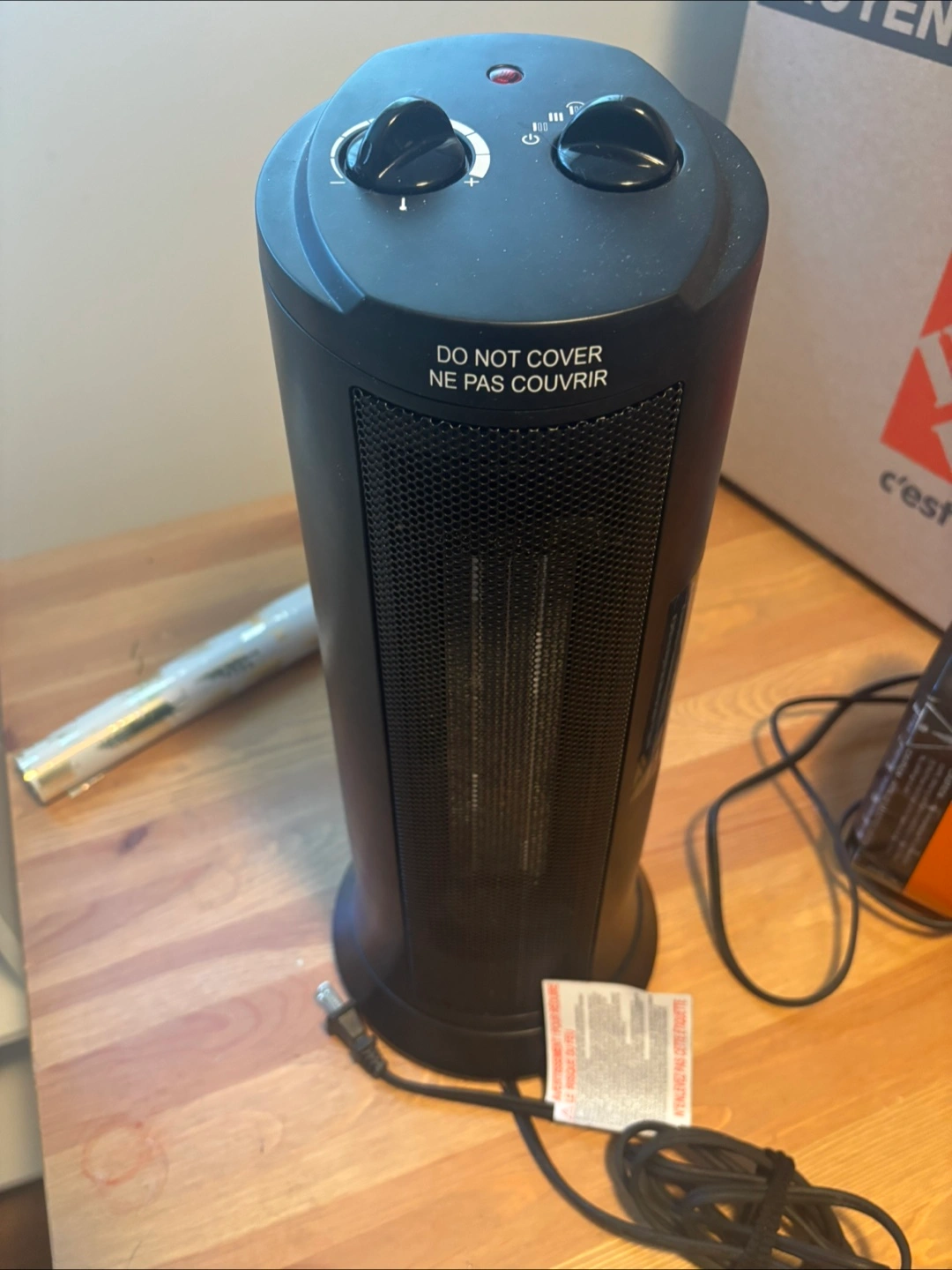 A nice portable space heater. Controls on the top, with a power indicator light. The black color is versatile for any decor, and it comes with a power cord. Curl up with a good book beside this heater on a cold day.
