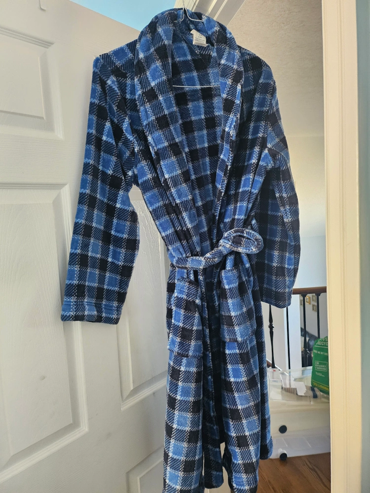 Two fleece robes, one blue and black plaid and one grey. Both are long-sleeved, have a tie belt, and two pockets.