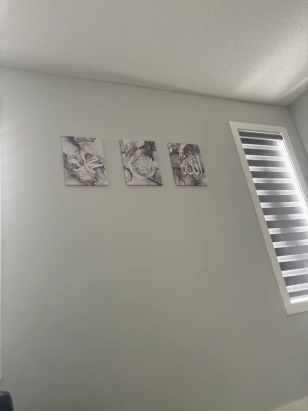 A set of three canvas prints featuring Islamic calligraphy and a marble-like design. These pieces add a touch of elegance to any room. Perfect for adding a spiritual and artistic element to your home décor.