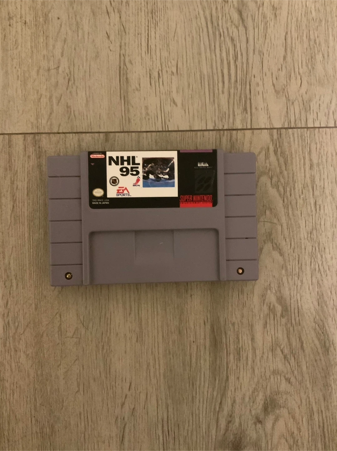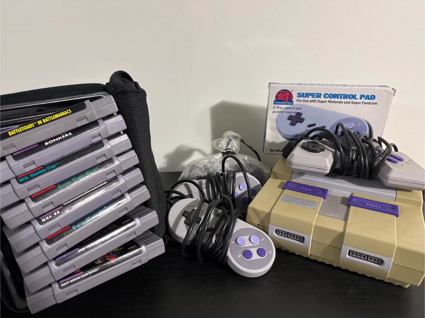 Get this Super Nintendo console, games, and controller for your retro gaming fun! It includes "Super Mario World", "NHL 95", "NHL Stanley Cup", "Battletoads in Battlemaniacs", "Bonkers", "Mighty Morphin Power Rangers", and a "Super Control Pad". Perfect for reliving classic gaming moments!