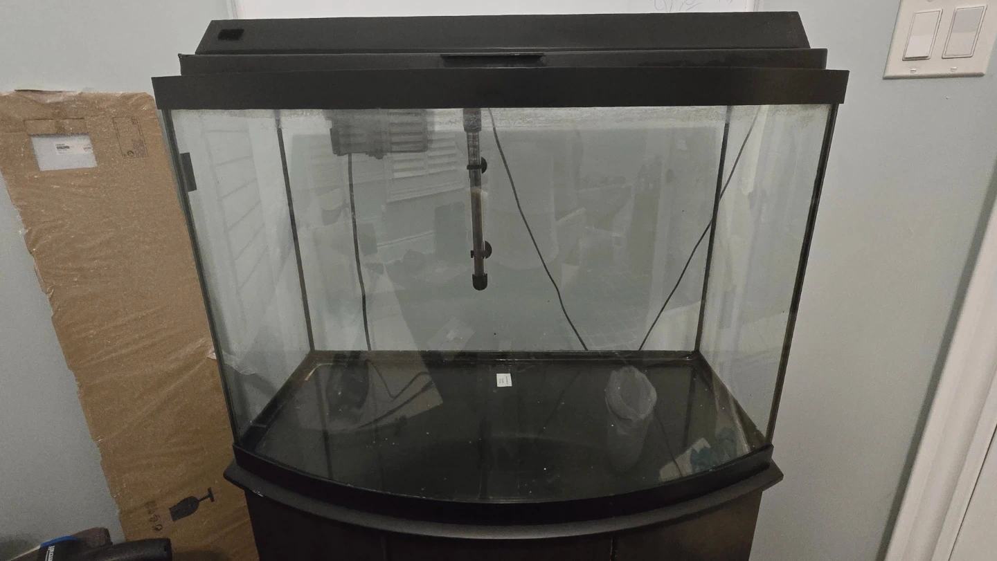 This is a curved bow style 37 gal aquarium with a dark wood stand. It comes with a heater and an AquaClear 50 filter. The tank is quite spacious, has led lights, suitable for a good variety of fish.