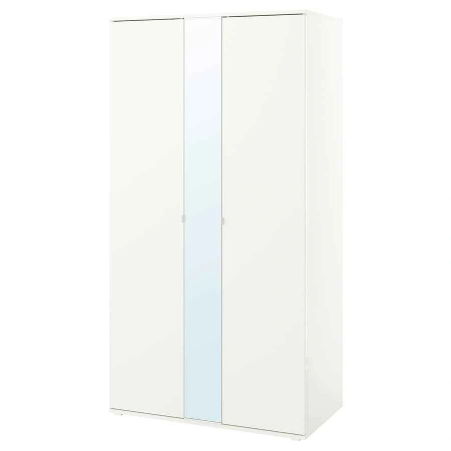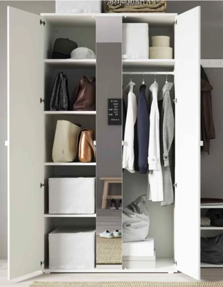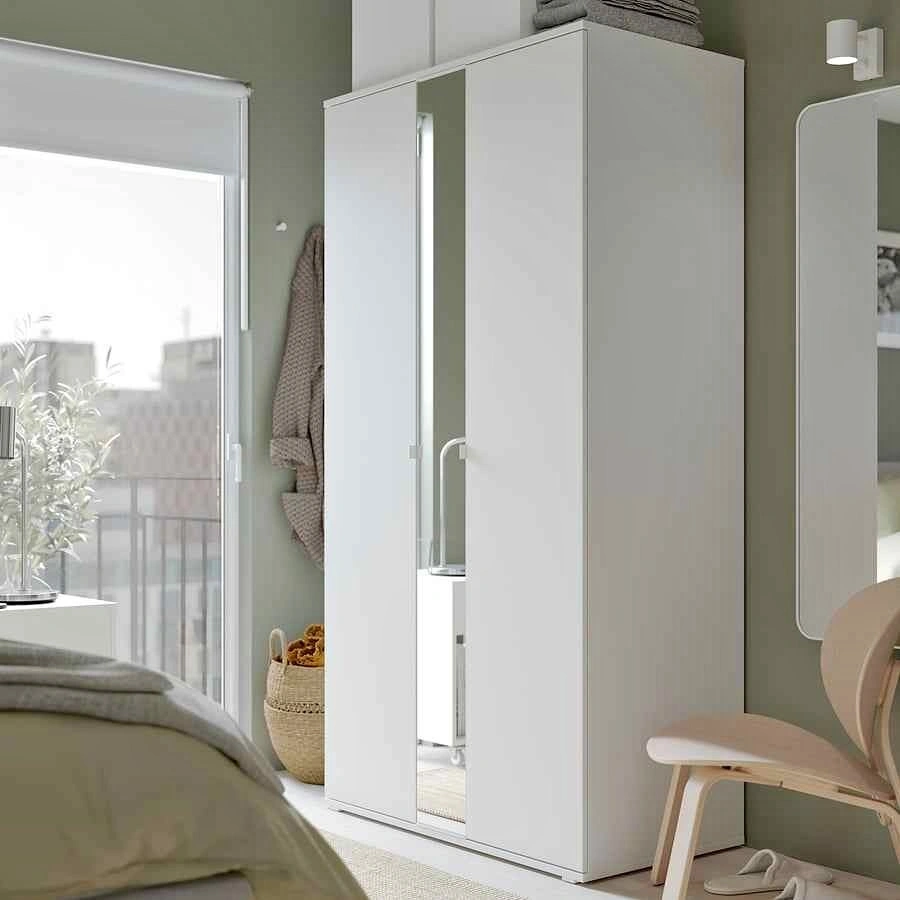 Has integrated full-length mirror, makes room feel bigger, saves wall space. Clothes rail can mount at 2 different heights. Handles included. Comes with 1 clothes rail and 5 shelves.