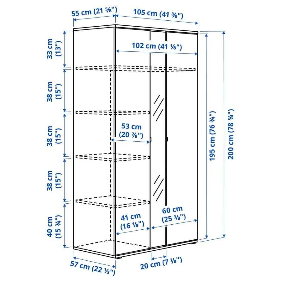 Has integrated full-length mirror, makes room feel bigger, saves wall space. Clothes rail can mount at 2 different heights. Handles included. Comes with 1 clothes rail and 5 shelves.