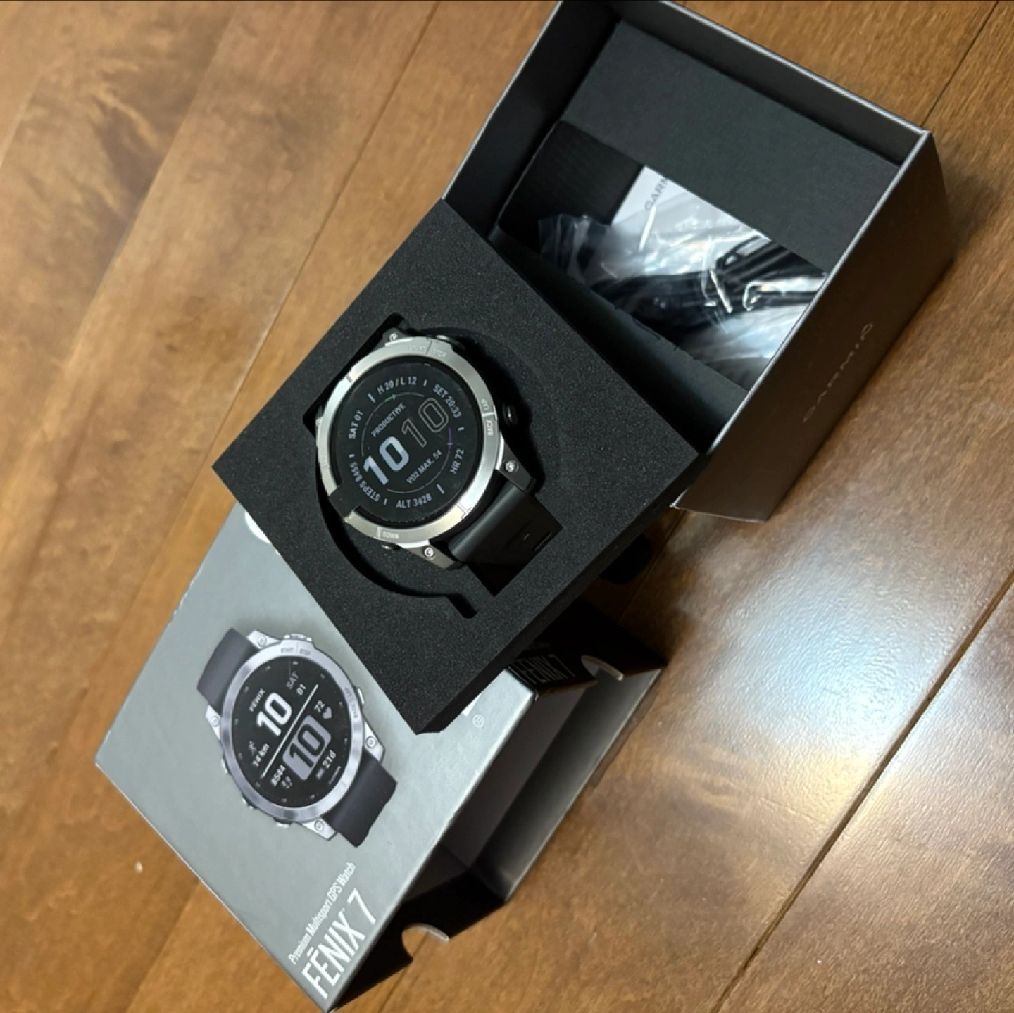 New in box. Premium Multisport GPS watch. Silver bezel and black band. Includes box and accessories.