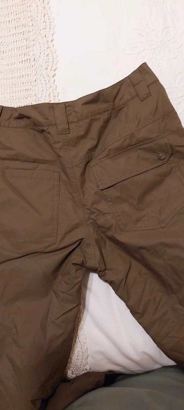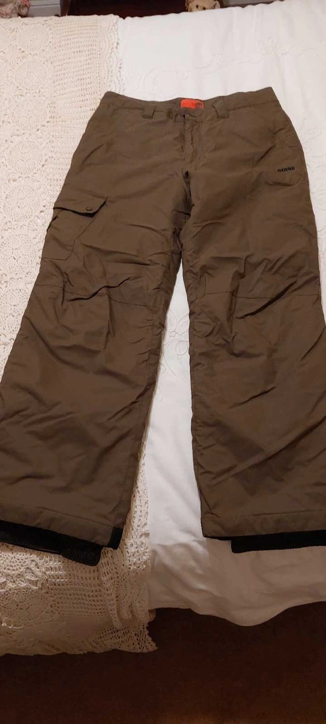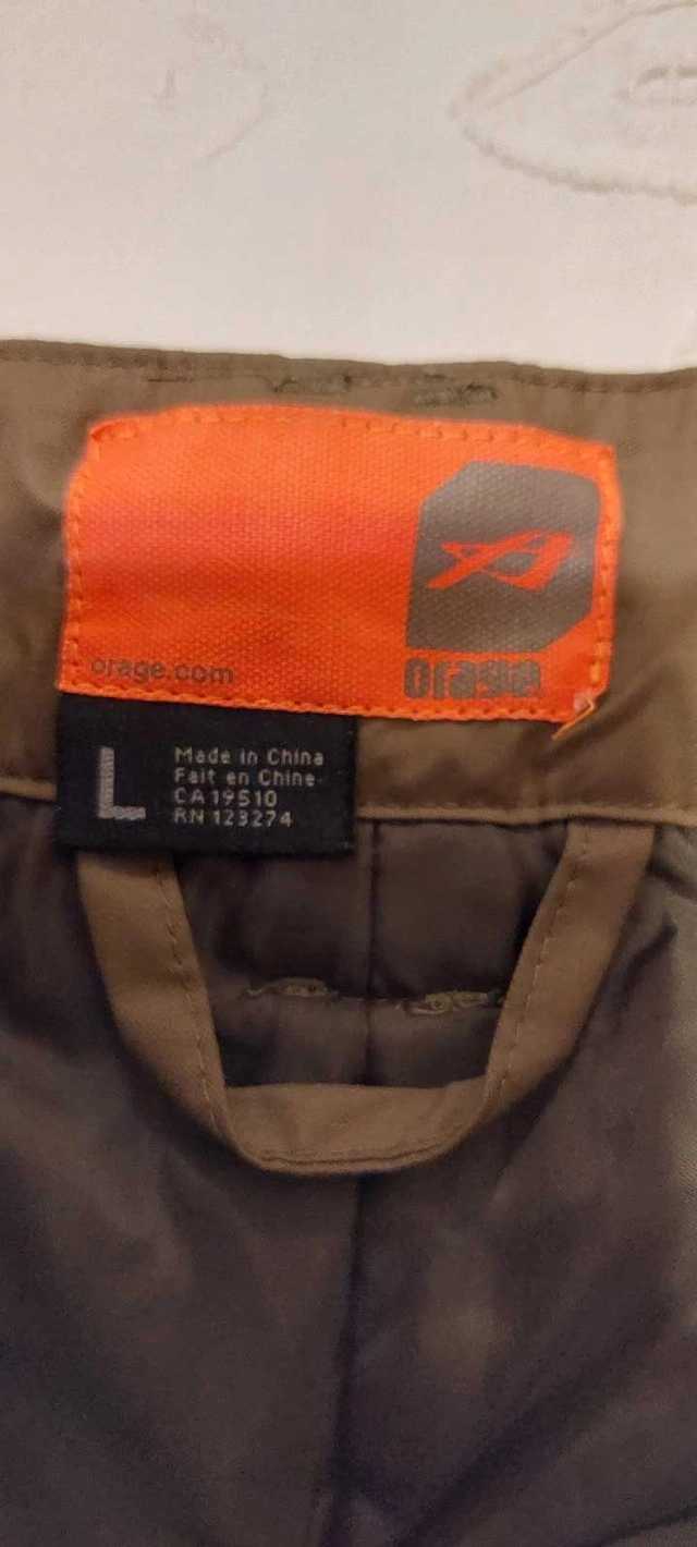 These are Orage snowboarding pants in a size large. They are in excellent condition. Their are two zippered pockets, two velcro pockets, and one extra pocket. They have elastic around the leg bottoms. Here are some features of the pants: * Waterproof and breathable fabric * Cargo pockets * Adjustable waist. If the ad's up, the pants are available!