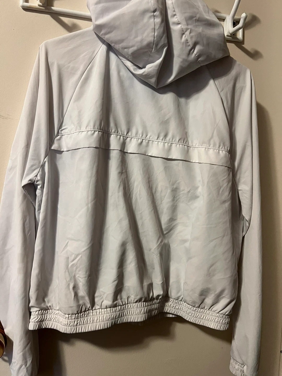 Selling an Onzie windbreaker jacket in size medium/large. It's a white colour, perfect for layering!