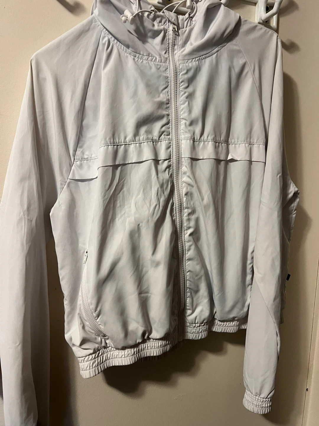 Selling an Onzie windbreaker jacket in size medium/large. It's a white colour, perfect for layering!