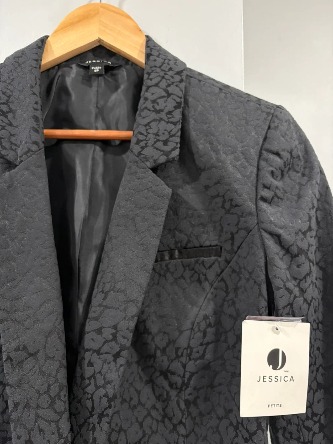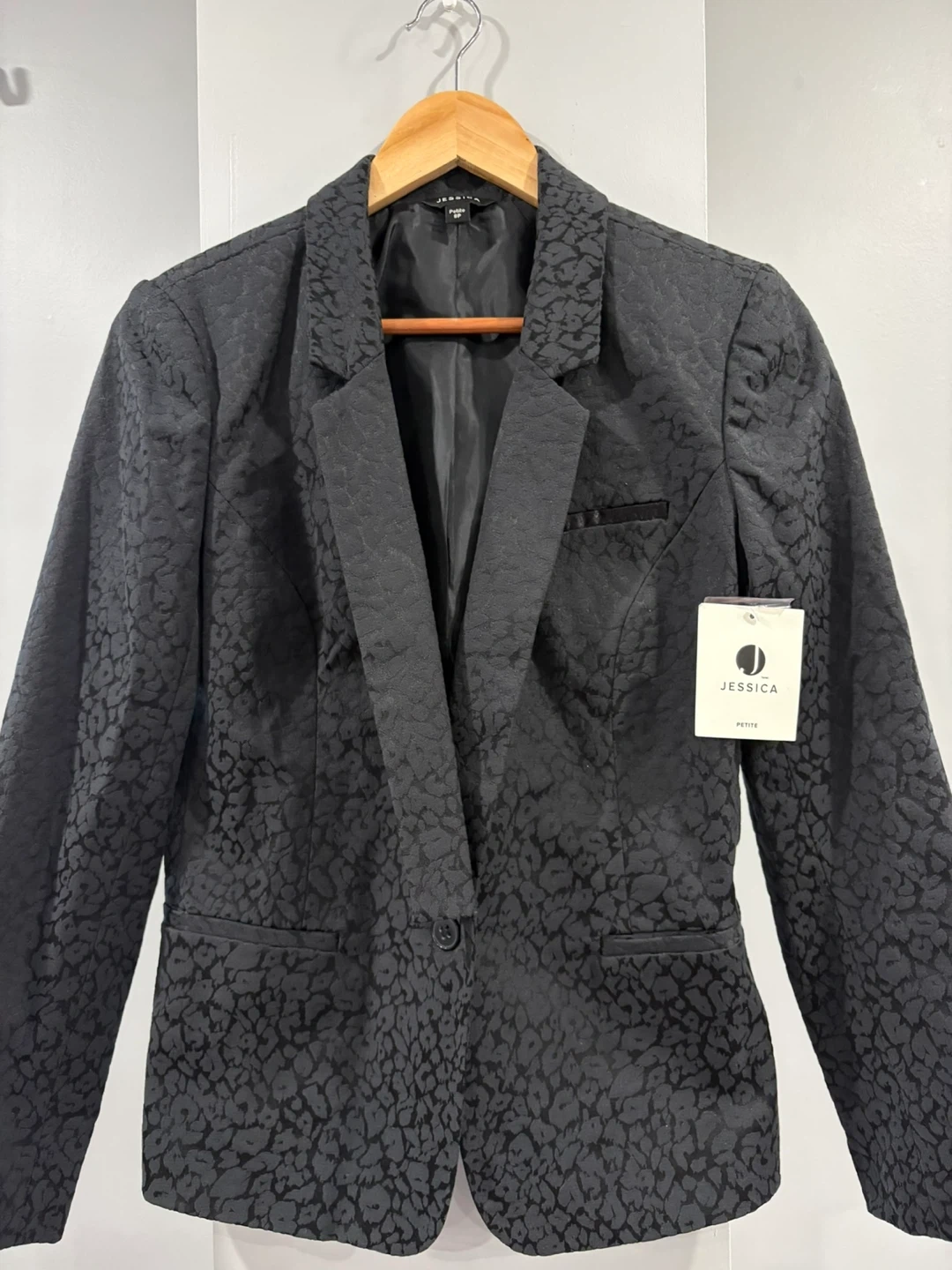 This Jessica petite blazer features a stylish black jacquard pattern. It has a single button closure and a notched lapel. The material is a polyester blend.