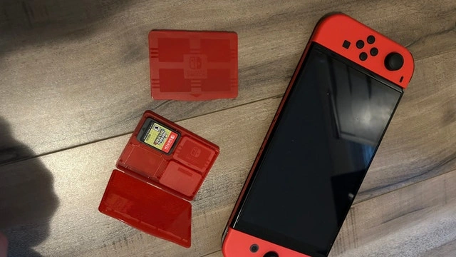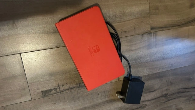 Super Mario Bros. U Deluxe game cartridge, and charging dock.