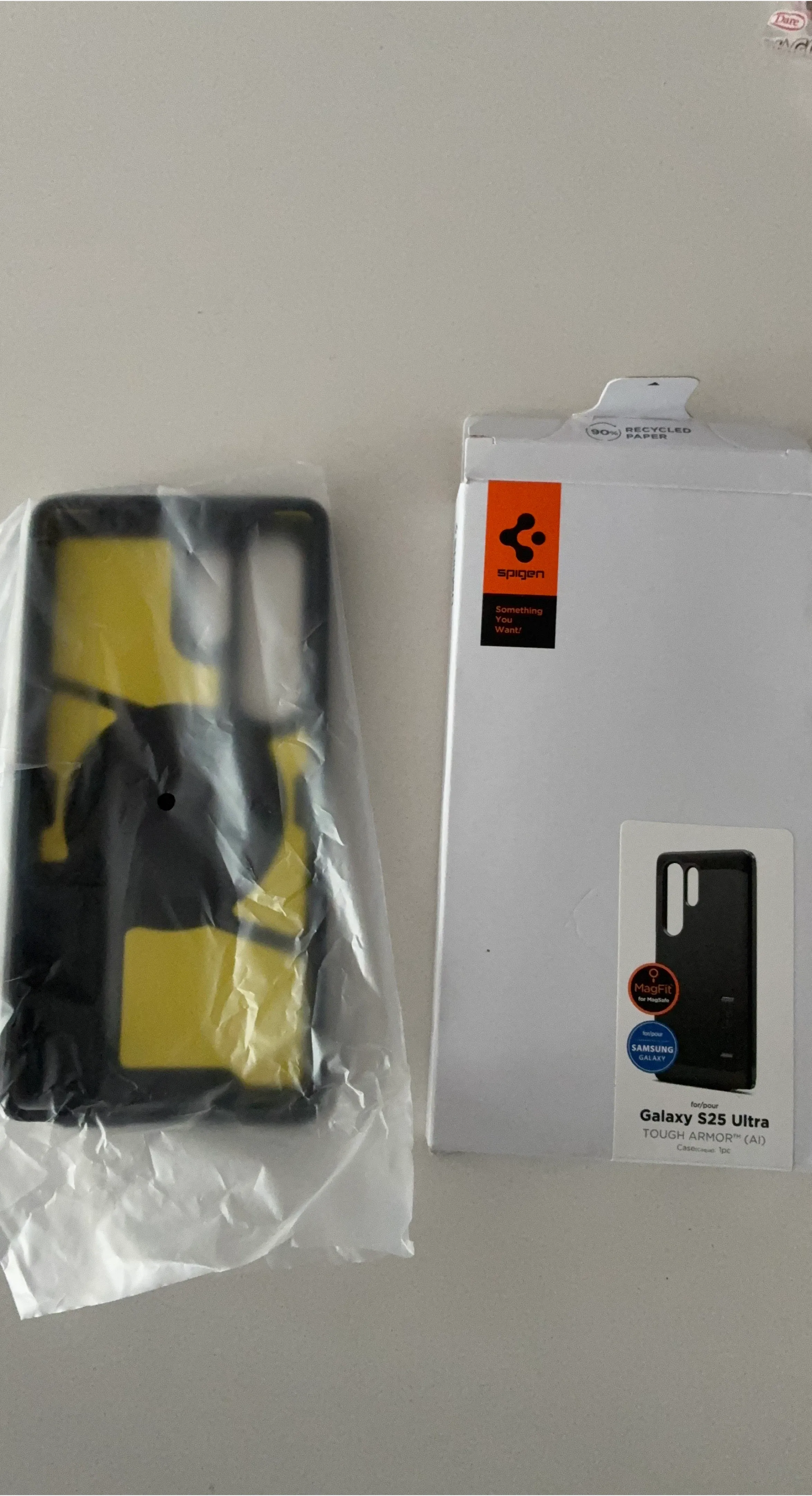 This is a Spigen Tough Armor case designed for the Samsung Galaxy S25 Ultra. It features MagFit for MagSafe compatibility. The case is black with yellow accents and comes in its original packaging.