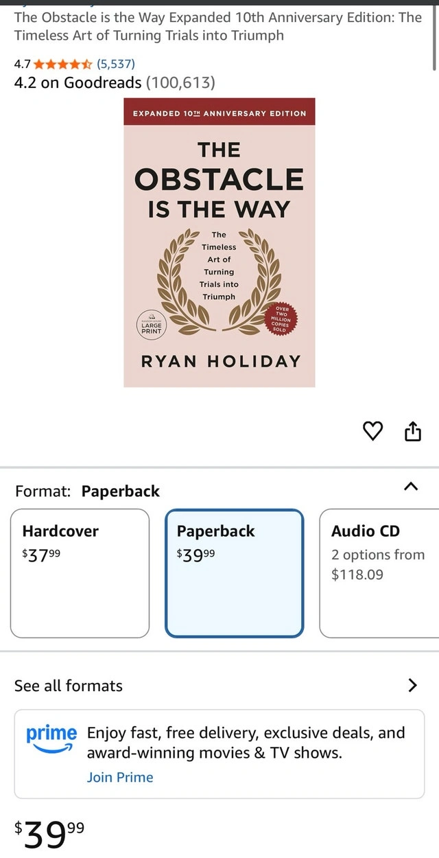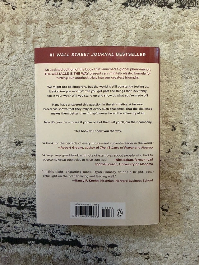 This is a paperback edition of Ryan Holiday's "The Obstacle is the Way: The Timeless Art of Turning Trials into Triumph." The book is the expanded 10th-anniversary edition, and appears to be in good condition. Author: Ryan Holiday, Edition: Expanded 10th Anniversary, Format: Paperback, Genre: Self-Help, Philosophy. Price: $25 CAD. If the ad is up, the item is still available.