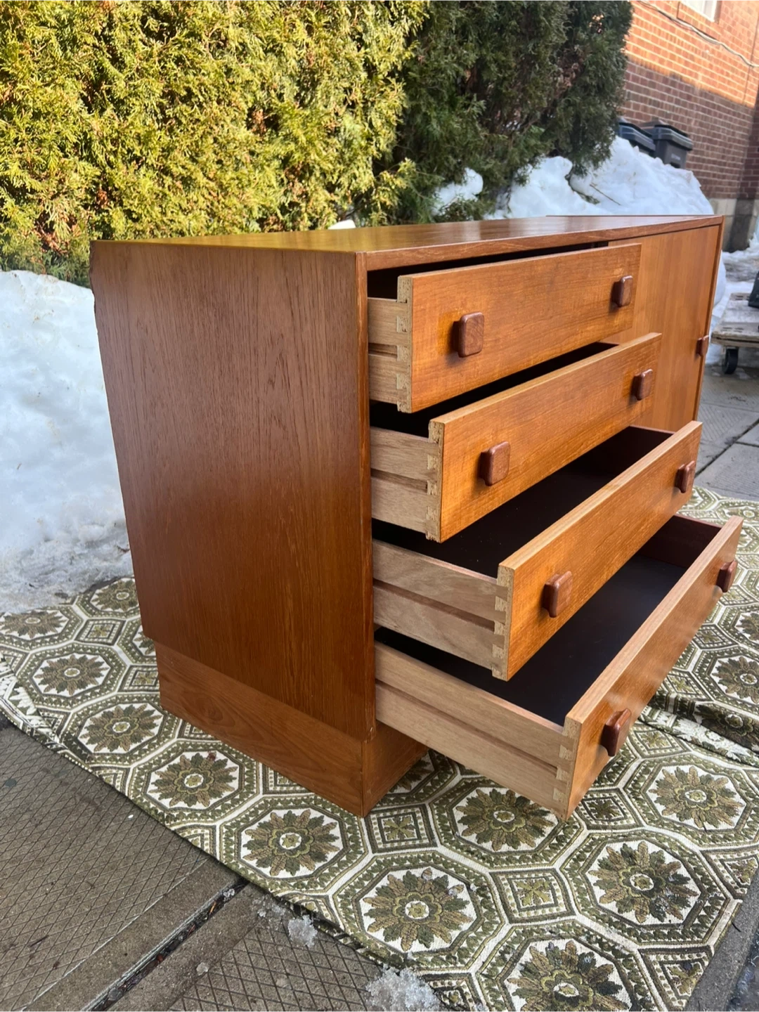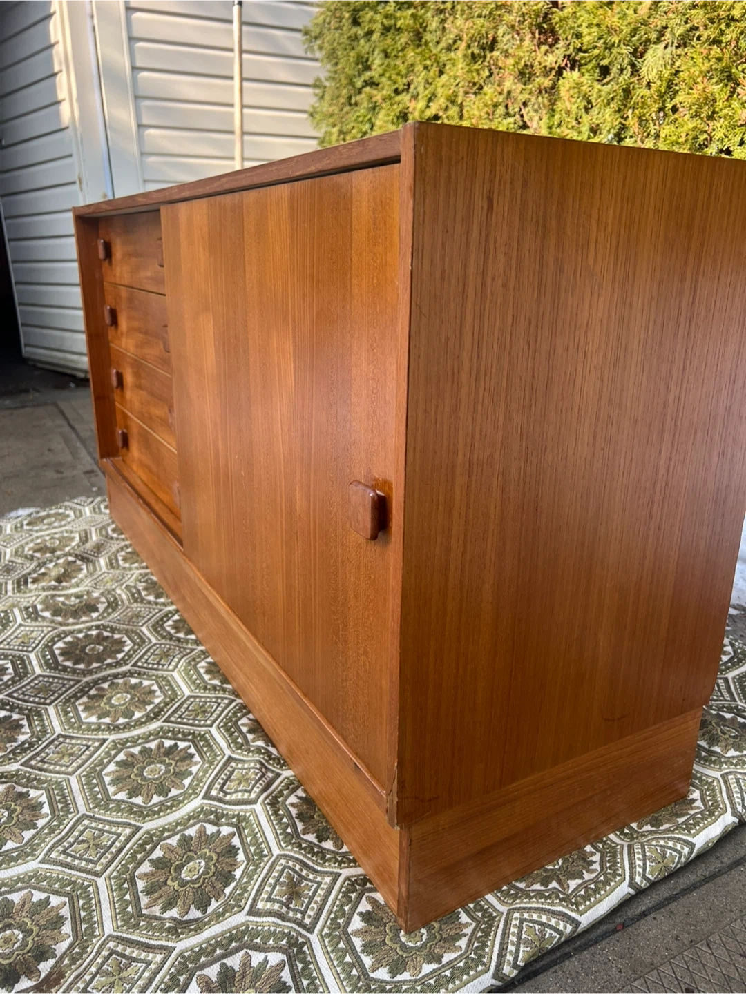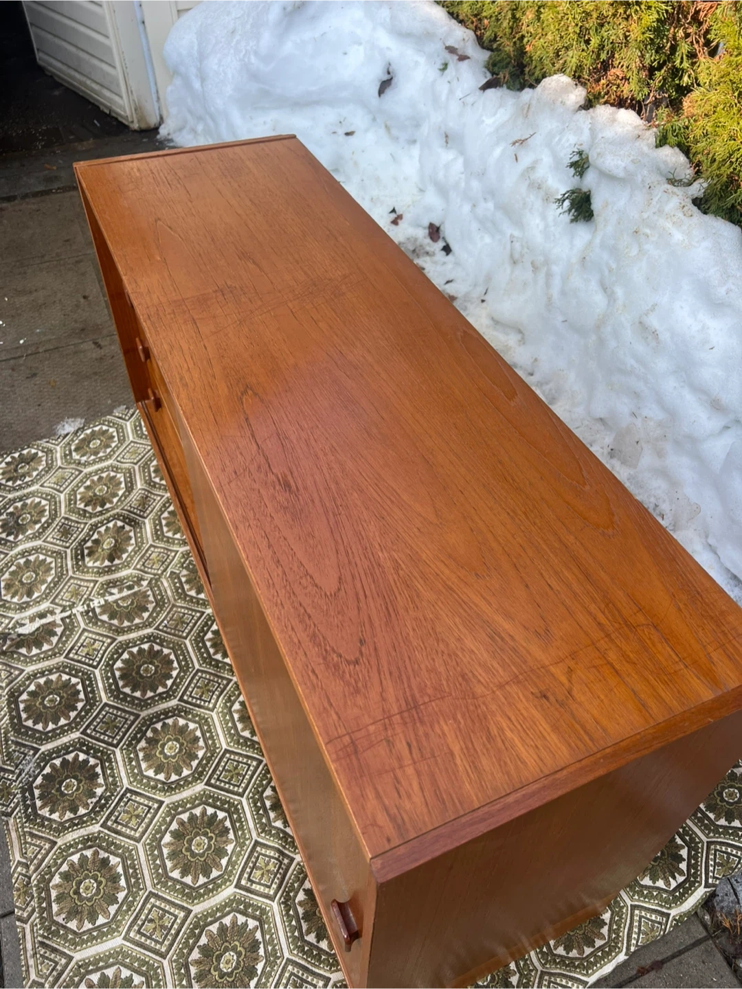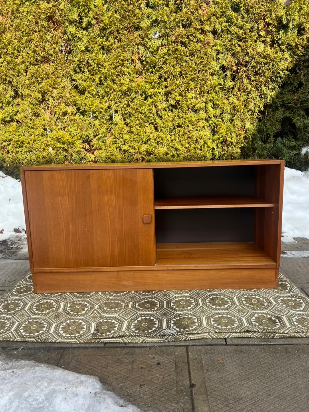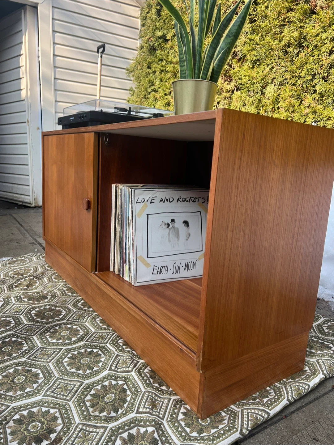 Compact Mid Century Modern teak cabinet by Domino Møbler, showcasing a warm, rich teak finish and clean Scandinavian lines. In good vintage condition, it works beautifully as a credenza, TV stand, or record cabinet. Perfectly sized for vinyl storage, with an adjustable interior shelf for flexible organization.