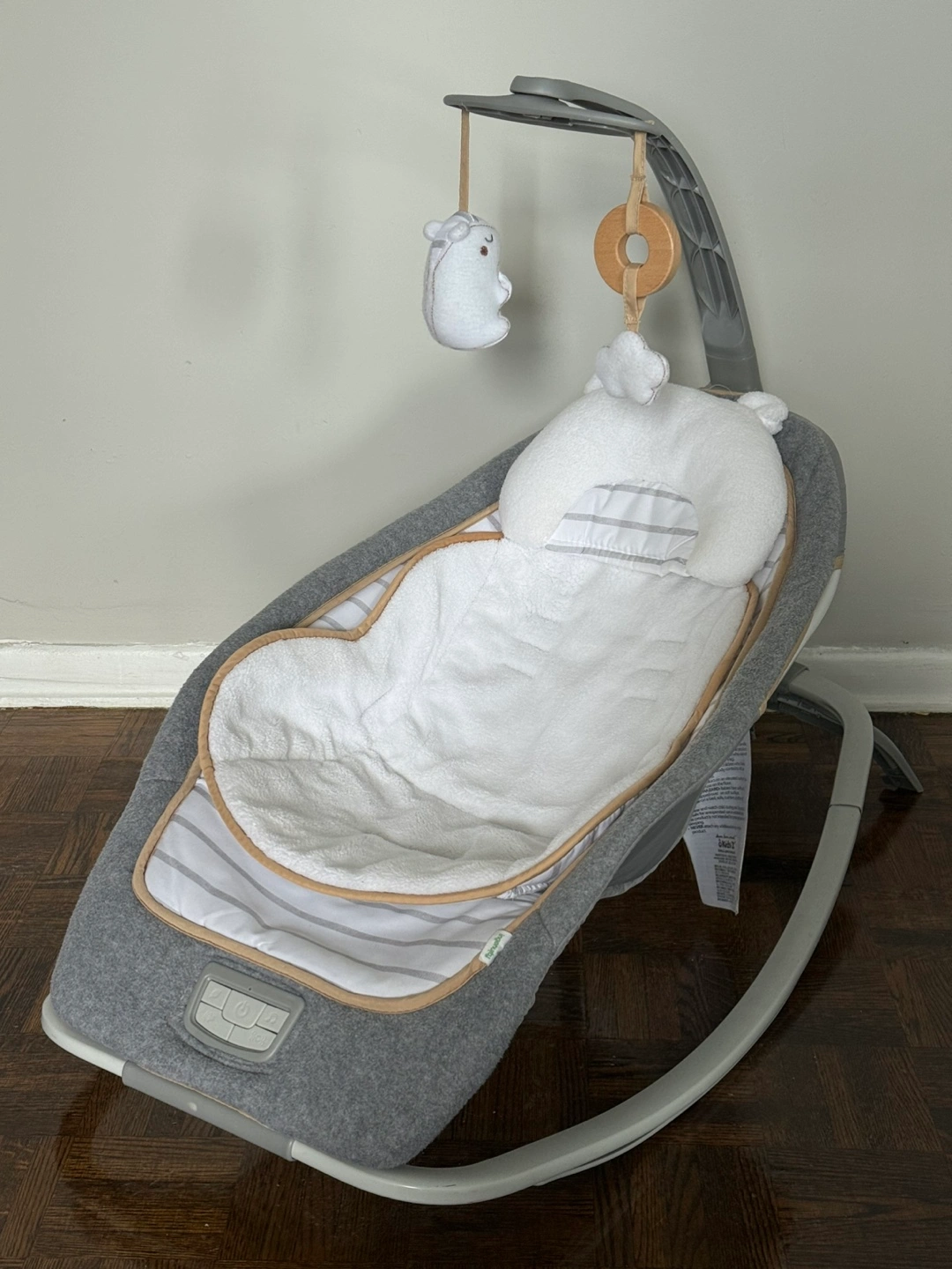 This Ingenuity rocking seat is perfect for little ones! The seat is grey and white with a cute mobile attached. Batteries included.
