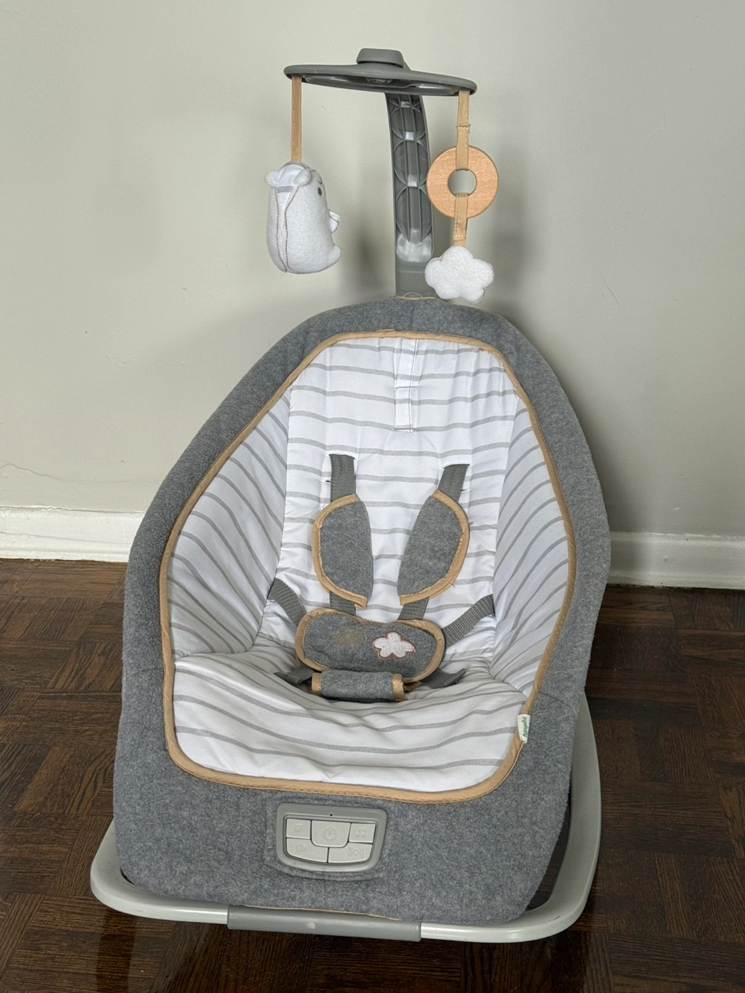 This Ingenuity rocking seat is perfect for little ones! The seat is grey and white with a cute mobile attached. Batteries included.