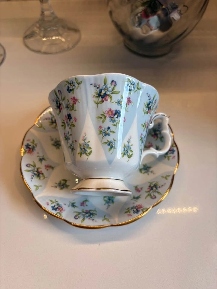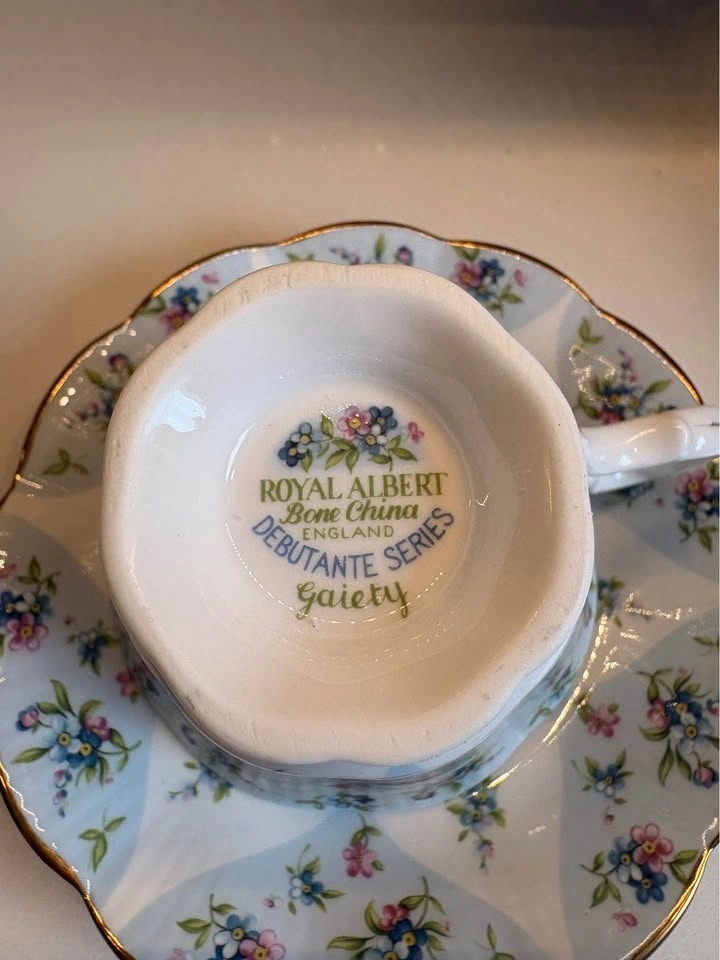 Beautiful Royal Albert Bone China teacup and saucer set. This is from the Debutante Series in the Gaiety pattern. Has pretty blue and pink floral design with light blue accents. Gold trim is on the edges of both the cup and saucer.