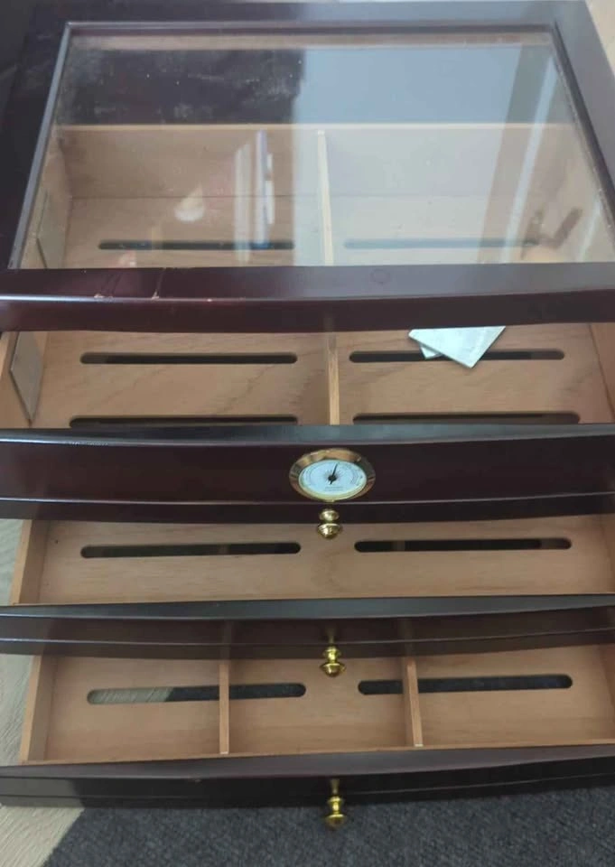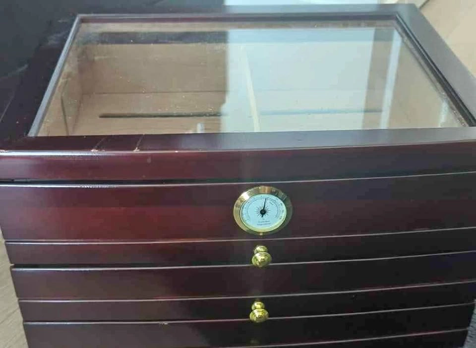 Large desktop humidor with 3 drawers for organization; holds up to 150 cigars. Lined with premium kiln-dried Spanish cedar.