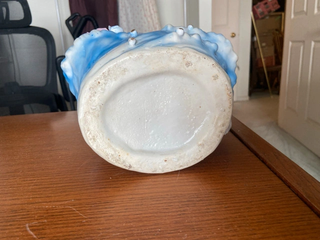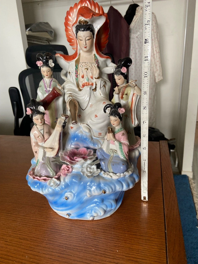 This striking Quan Yin statue features intricate detailing and vibrant colours, depicting the goddess surrounded by attendant figures amidst swirling waves. It's a pre-owned item that stands approximately 12 inches tall, perfect for collectors or anyone seeking a unique decorative piece. It is in good condition, however there are imperfections due to age. Please review all photos before purchasing.