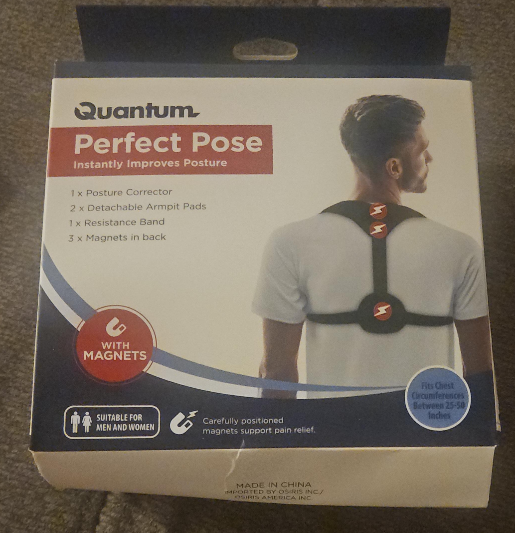 Get ready to improve your posture with this Quantum Perfect Pose posture corrector! It comes with: - 1 posture corrector - 2 detachable armpit pads - 1 resistance band - 3 magnets in the back Suitable for both men and women, and fits chest circumferences between 25-50 inches. bought new too small.